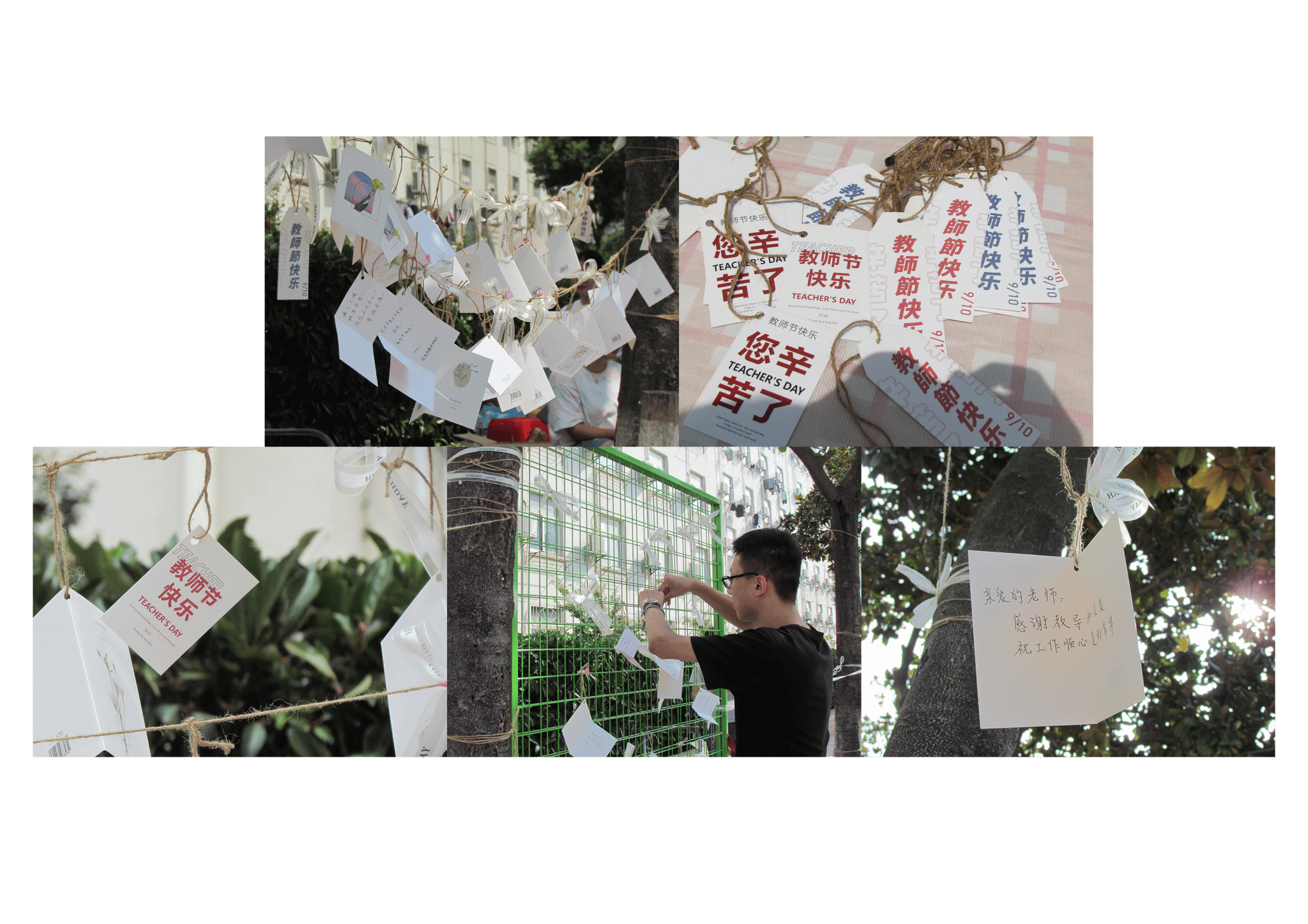 隨后展開手繪賀卡送祝福活動。志愿者在樹下設立自制賀卡展示區,供學生們展示親手書寫的祝??ǎ心顜煻鳌@蠋焸円苍谡拱迳虾灻?,給教師節活動畫下了完美的句號,營造了溫馨愉悅的校園氛圍,拉近了老師與同學們之間的距離。