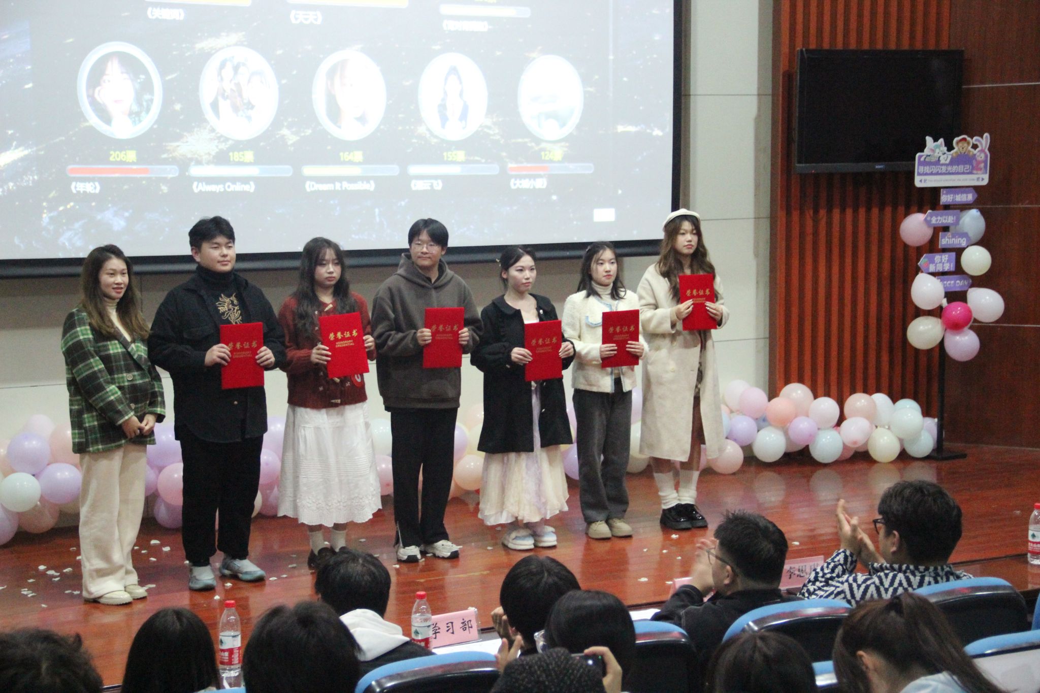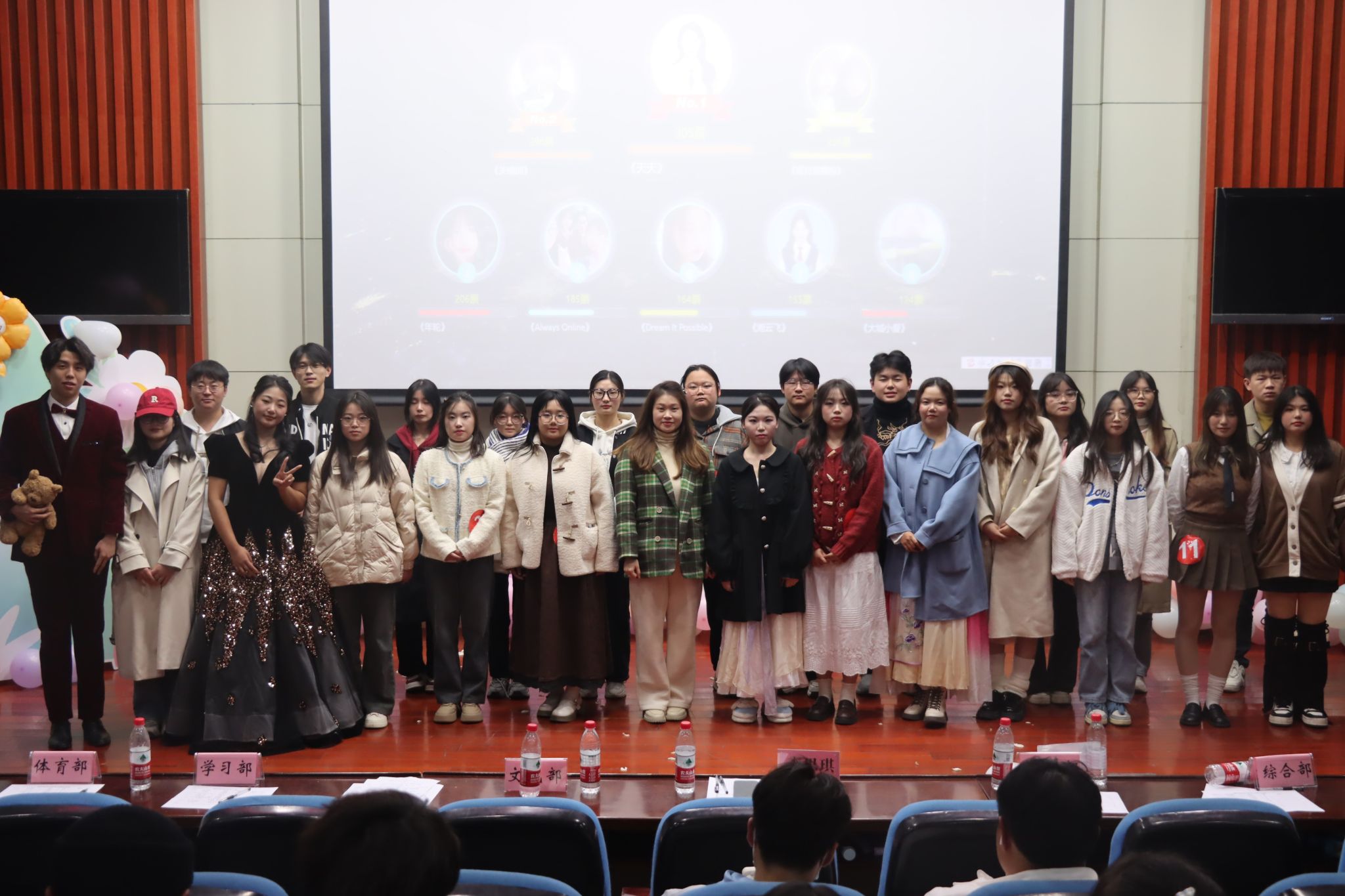 大賽作品精彩紛呈,形式多樣,涵蓋了舞蹈、聲樂、樂器等多個類別。其中舞蹈《湘云飛》《天若有情》《年輪》優雅曼妙、精彩絕倫;歌曲《一笑傾城》、《天天》活潑靈動、青春洋溢;樂器陶笛帶來的《大魚》旋律悠揚,遼闊空靈。在場的同學爆發出一次次歡呼的聲浪,推動活動達到高潮。過激烈的投票和評分,最后由水瑞瑞《天若有情》摘得大賽桂冠。