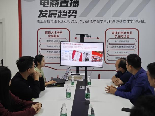 在調研第二站武漢商貿職業技術學院,校企雙方詳細探討了京東產業學院項目落地的具體細節,以及依托產業學院如何開展專業群建設、教學模式改革、學生實習實訓和雙元育人成果打造等方面的問題。