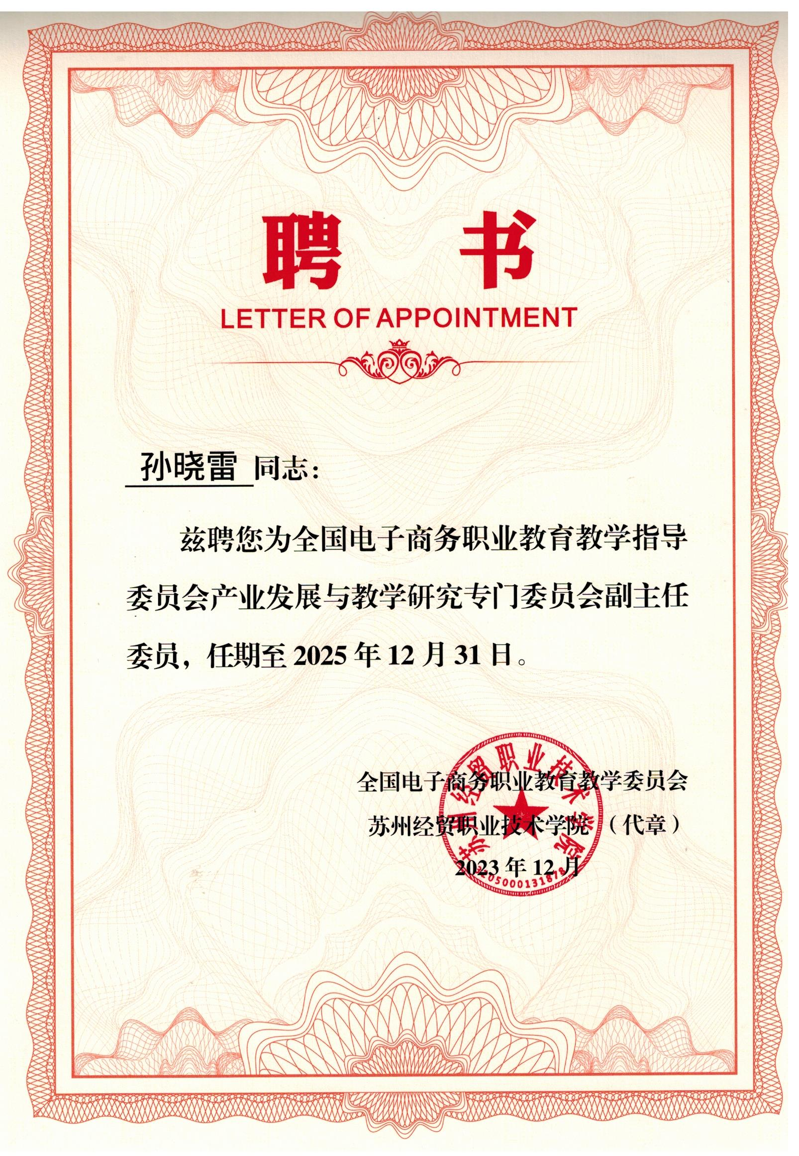 為深入學(xué)習(xí)貫徹黨的二十大精神和習(xí)近平總書記關(guān)于職業(yè)教育工作的系列重要指示精神,落實(shí)中央辦公廳、國務(wù)院辦公廳《關(guān)于深化現(xiàn)代職業(yè)教育體系建設(shè)改革的意見》等文件要求,增強(qiáng)數(shù)字商務(wù)行業(yè)核心競爭力,助推產(chǎn)業(yè)發(fā)展,12 月8日至10日,全國電子商務(wù)職業(yè)教育教學(xué)指導(dǎo)委員會(huì)在江蘇省蘇州市召開產(chǎn)業(yè)發(fā)展與教學(xué)研究專門委員會(huì)成立大會(huì)暨第一次全體會(huì)議。院黨委副書記、院長孫曉雷受邀擔(dān)任專門委員會(huì)副主任委員。