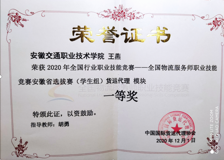 11月14日,由中國國際貨運代理協會主辦,安徽警官職業學院承辦的2020年安徽省物流服務師職業技能競賽圓滿落幕。安徽省物流服務師職業技能大賽作為全國物流服務師職業技能競賽安徽省選拔賽,包括運輸業務設計與運營、貨運代理兩個模塊。我校2018級物流管理專業王燕同學在胡勇老師的指導下參加了貨運代理項目。本次貨運代理項目競賽,借鑒世界技能大賽命題方法和考核內容,包括客戶咨詢、報價計算、投訴及異常情況處理等任務。本次選拔賽對參賽選手的專業知識、操作技能、職業素養以及溝通與表達能力進行綜合考評。經過6小時的激烈角逐,王燕獲得貨運代理項目一等獎。同時,也將獲得參加2020年全國物流服務師總決賽的資格。(胡勇)