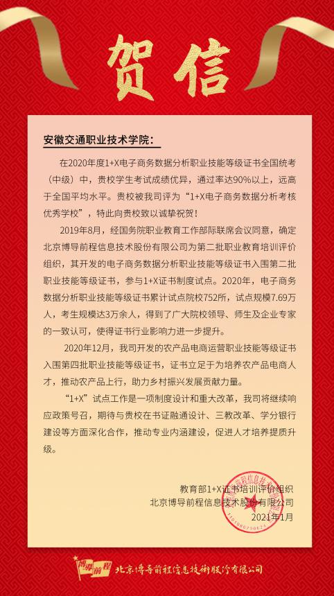 近日,我院被教育部1+X證書培訓(xùn)組織單位——北京博導(dǎo)前程信息技術(shù)股份有限公司評(píng)為“1+X電子商務(wù)數(shù)據(jù)分析考核優(yōu)秀學(xué)校”。