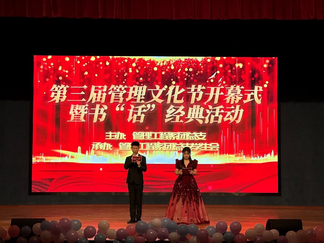 為深入學習貫徹習近平新時代中國特色社會主義思想,推進校園文化建設,豐富大學生校園文化生活,5月11日下午,管理系團總支在南區大禮堂舉辦第三屆管理文化節開幕式暨閱讀沙龍活動。管理系黨總支書記汪思曼、副書記陶琪,學生處副處長、院團委書記劉元元,院團委委員、大學生藝術團指導老師王萌鈺以及管理系學管教師出席本次開幕式,并擔任書“話”經典活動評委。