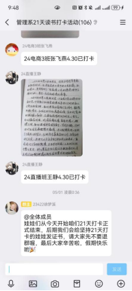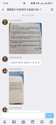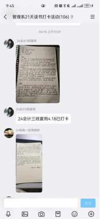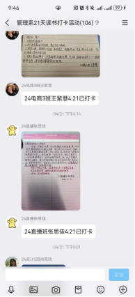 在21天的打卡期間,同學們制定了閱讀計劃,利用課余的碎片化時間閱讀推薦書籍,在群里記錄自己的閱讀時光,分享自己的見解和感悟。他們以書會友,在心得交流中遇見了志同道合的朋友,養成了良好的閱讀習慣。
