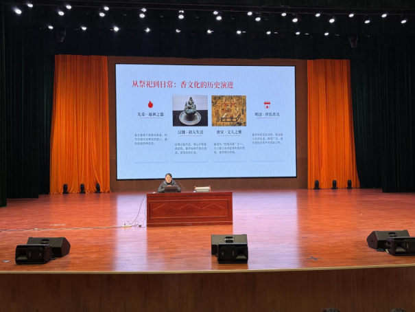祝玉老師以“一縷清韻,千年傳承”為主題,從“香之溯源”“天長流芳”“匠心獨運”“古韻新生”等多個維度,為同學們系統(tǒng)講解了中華香文化的歷史脈絡、天長文人香的傳承譜系與文化內(nèi)涵、傳統(tǒng)制香工藝與香方智慧,以及非遺傳承在當代的創(chuàng)新實踐路徑。她結(jié)合自身經(jīng)歷,生動講述了天長文人香從古代文人雅趣到如今非遺瑰寶的發(fā)展歷程,讓同學們深刻感受到非遺傳承人的堅守與匠心。