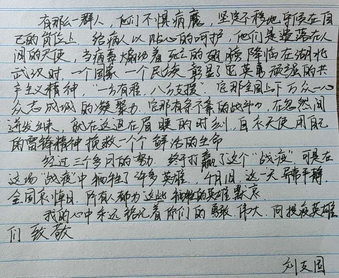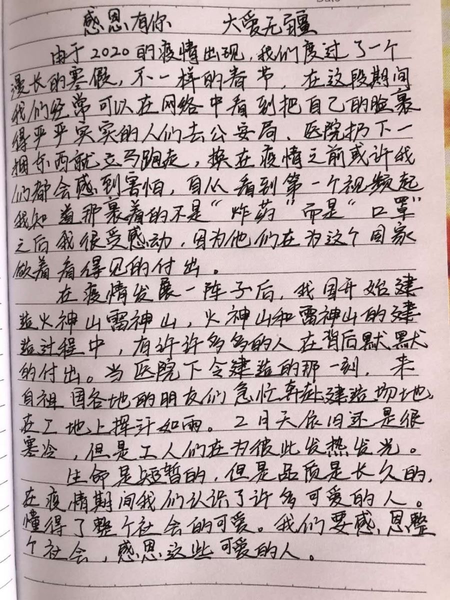 此次活動(dòng)獲得了同學(xué)們的熱情參與。大家通過繪畫和撰寫文章等方式,致敬疫情之下無私奉獻(xiàn)的醫(yī)護(hù)工作者,抒發(fā)自己對(duì)于社會(huì)、對(duì)于父母的感恩之情。此次活動(dòng)使同學(xué)們深深領(lǐng)悟到了感恩對(duì)人生的重要意義,提高了大家的感恩意識(shí)和文藝素養(yǎng)。