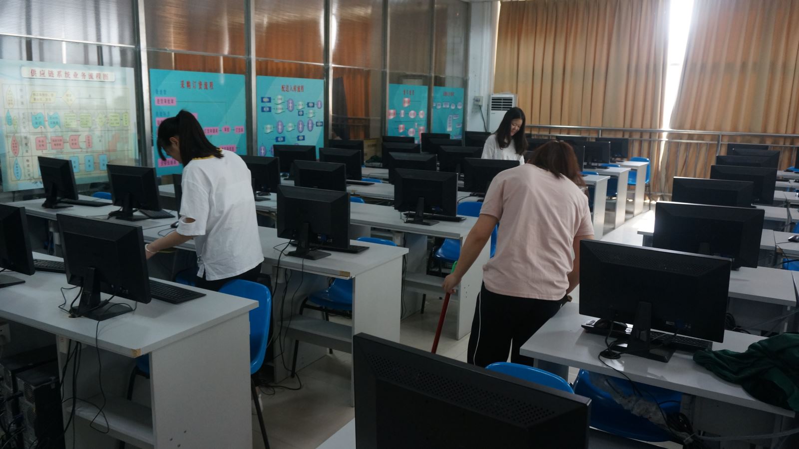 在到達集合地點——物流實訓室一樓后,學生會副主席丁晨對清掃任務進行了分工。同學們或擦窗戶,或掃地、拖地,或整理貨架,或打掃電腦室。有些同學在忙完手中活以后,還主動幫他人換水、洗拖把等等。從一樓到二樓,每個角落,都能見到大家忙碌的身影。同學們仔細地打掃,不放過任何死角,經(jīng)過一個多小時的團結奮戰(zhàn),實訓室地面纖塵不染,物品井然有序,整個實訓室煥然一新。