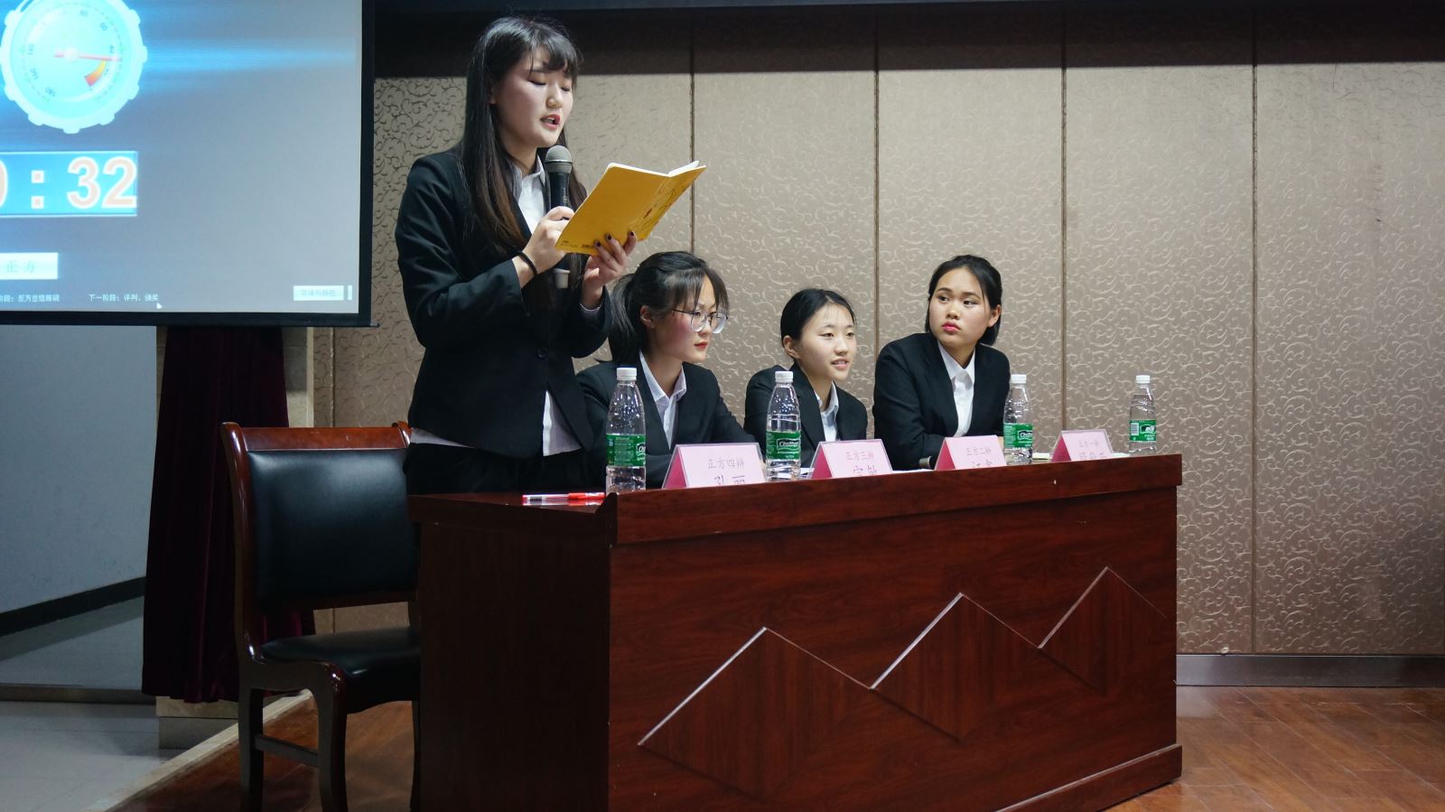 最后,評委們細商后一致裁定正方勝。當主持人宣布獲勝名單后,我系辯手們歡呼雀躍,相擁而笑。她們忘卻了賽前的困難和汗水,盡情地享受著當前的喜悅。期待著四位辯手在辯論賽總決賽中能夠大放異彩,彰顯我系風采!