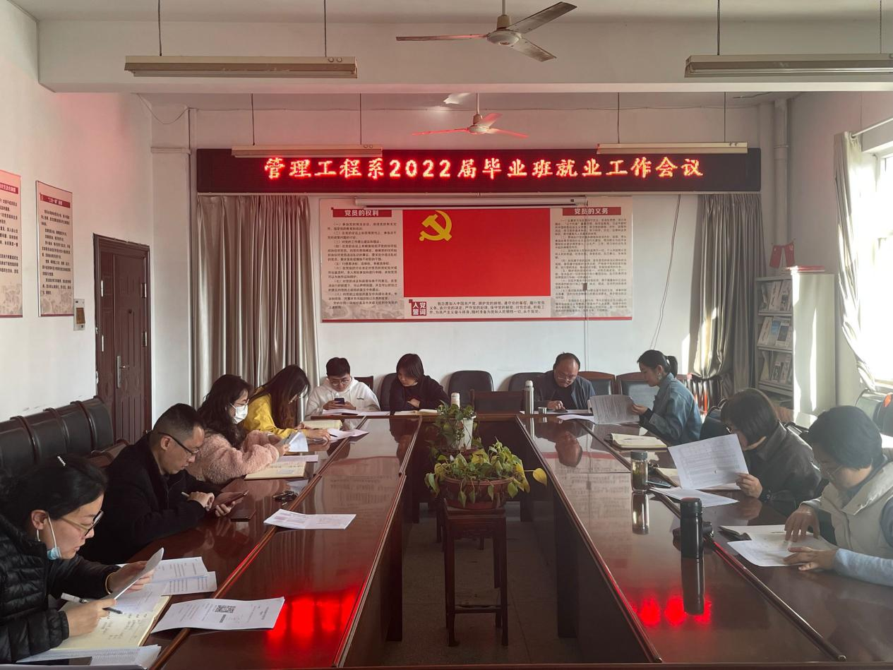 2022年3月9日下午,管理工程系在系五樓會議室召開2022屆畢業生就業工作會議。管理系書記汪思曼、副主任岳朝暉(主持工作)、副主任吳金菊、主任輔導員何基榮以及全體畢業班(含社招班)輔導員參加了會議,會議由汪思曼主持。