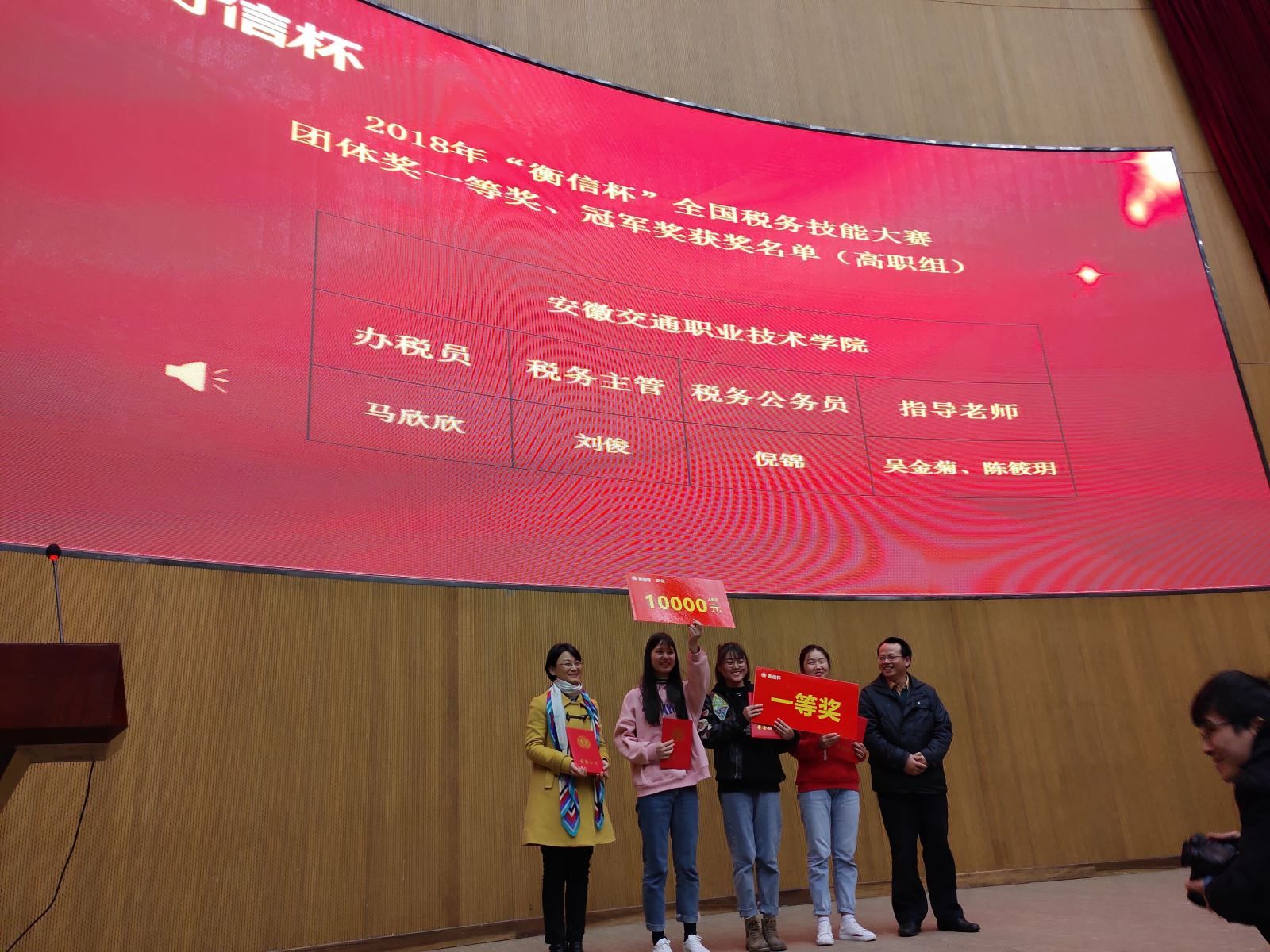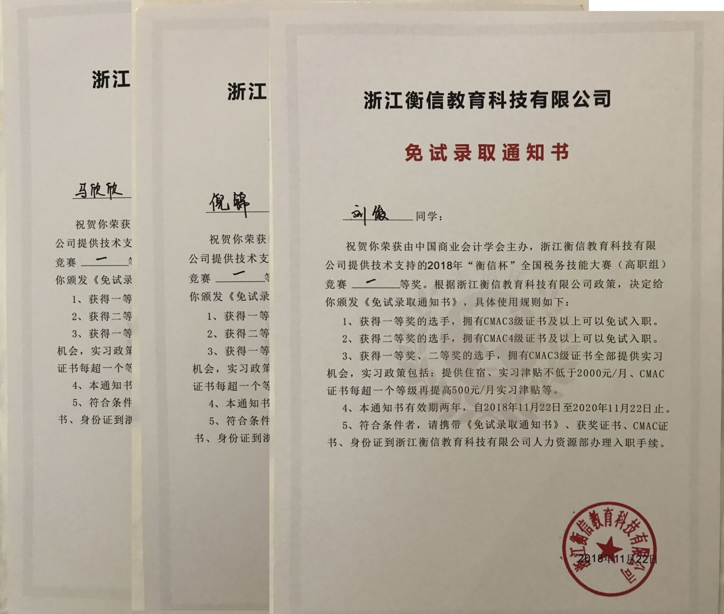 2018年11月21日,“衡信杯”全國稅務技能大賽全國總決賽在杭州舉行。由我院管理系會計專業吳金菊、陳筱玥兩位老師指導,16會計1班倪錦、劉俊、馬欣欣三名同學組成的參賽隊在激烈的角逐中以全國第一名的好成績榮獲高職組團體一等獎。同時,馬欣欣同學榮獲“辦稅員崗位”單項獎全國第一名,劉俊同學榮獲“稅務主管崗位”單項獎全國第二名,倪錦同學榮獲“稅務公務員崗位”單項獎全國第二名。三名同學不但獲得了榮譽,也打開了就業通道,獲得了“浙江衡信教育科技有限公司”的免試錄取通知書。
