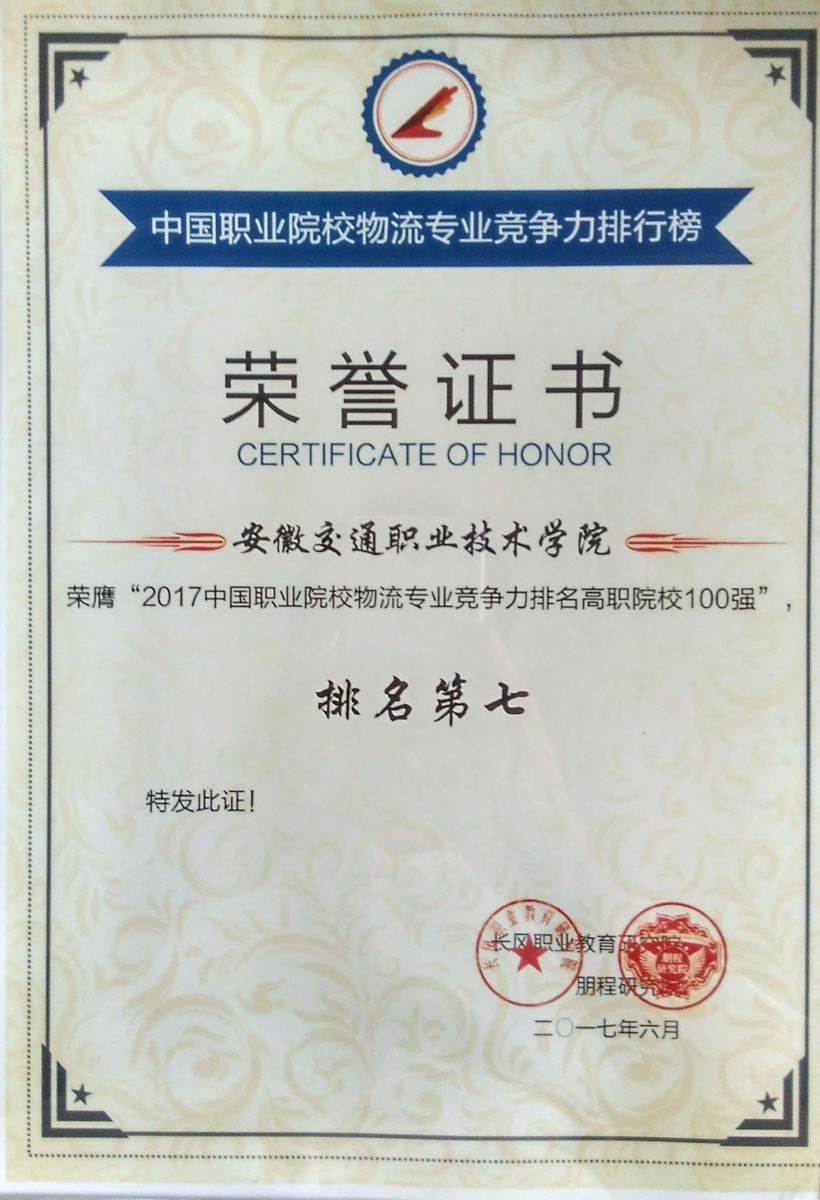 2017年6月29日,“2017年中國職業院校物流&電商專業競爭力排行榜”發布會在成都舉行。中國交通運輸協會副會長宋朝義、上海海事大學副校長楊萬楓、北京絡捷斯特科技發展股份有限公司董事長邵清東、上海新朋程信息科技有限公司總經理陳燕群蒞臨發布會,國內多所職業院校的代表、專家學者、相關領導、業內人士及媒體記者出席了本次發布會。我校物流專業在綜合評估中入圍榜單百強,并取得總排名第七的好成績。
