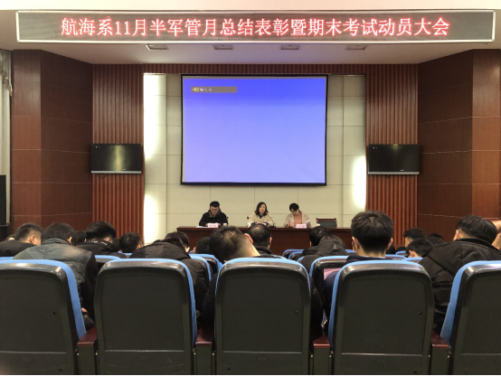 2018年12月18日晚,航海系召開11月份半軍管總結表彰暨期末考試動員大會,系書記朱蓉、學管老師劉婷,及航海系全體學生參加會議。