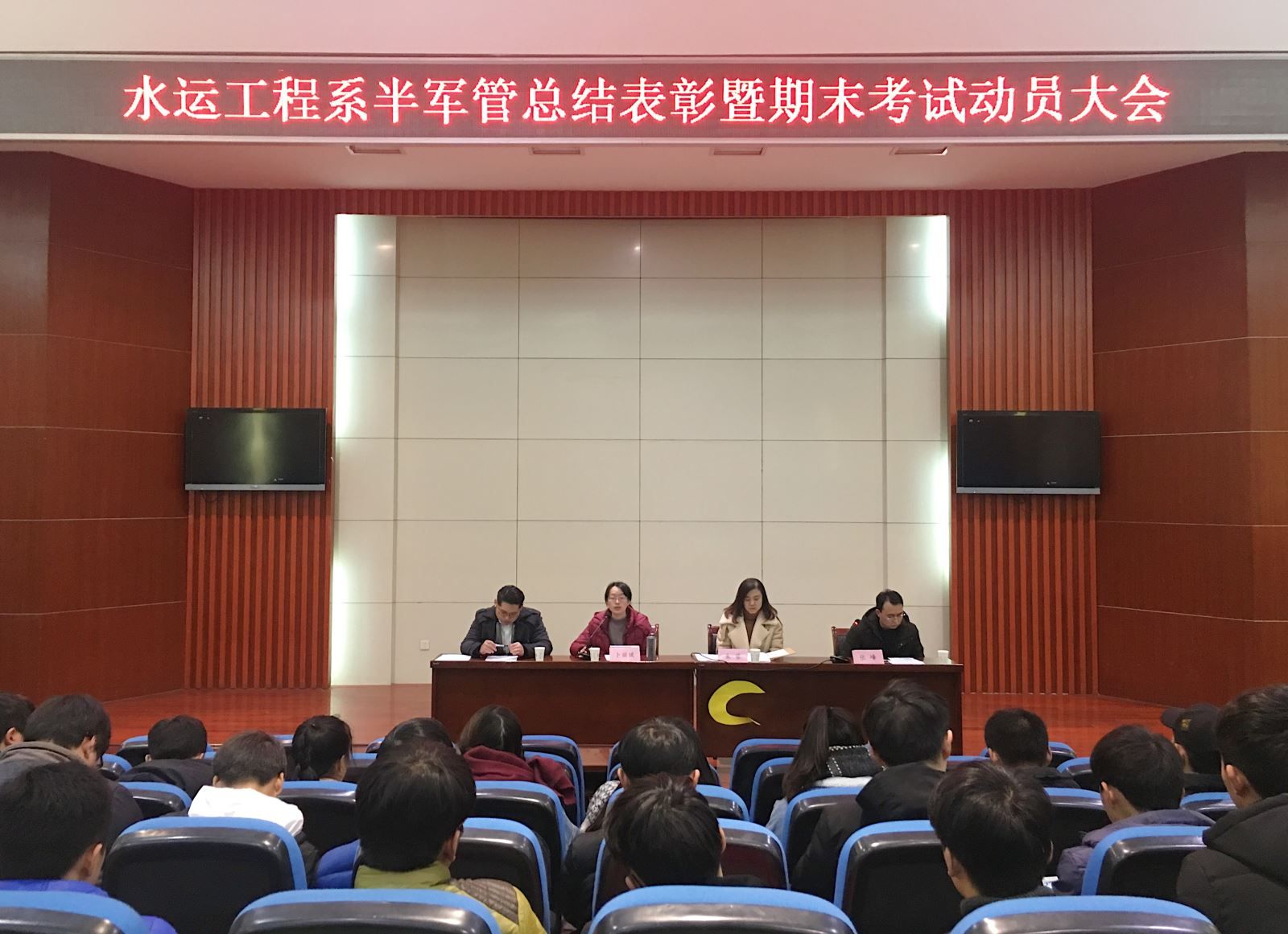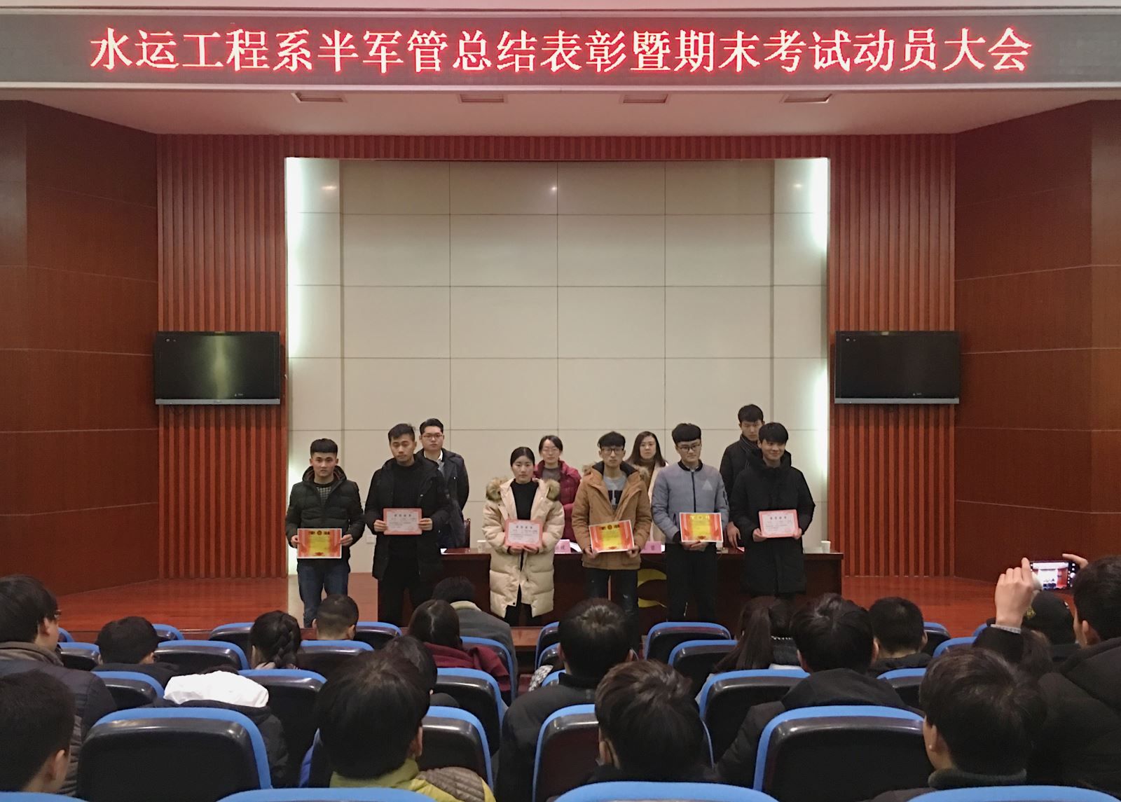 2018年1月9日晚,水運工程系召開期末半軍管總結表彰暨考試動員大會,水運系黨支部書記朱蓉、教學秘書張峰、學管老師卜麗媛以及全體學生參加了會議。