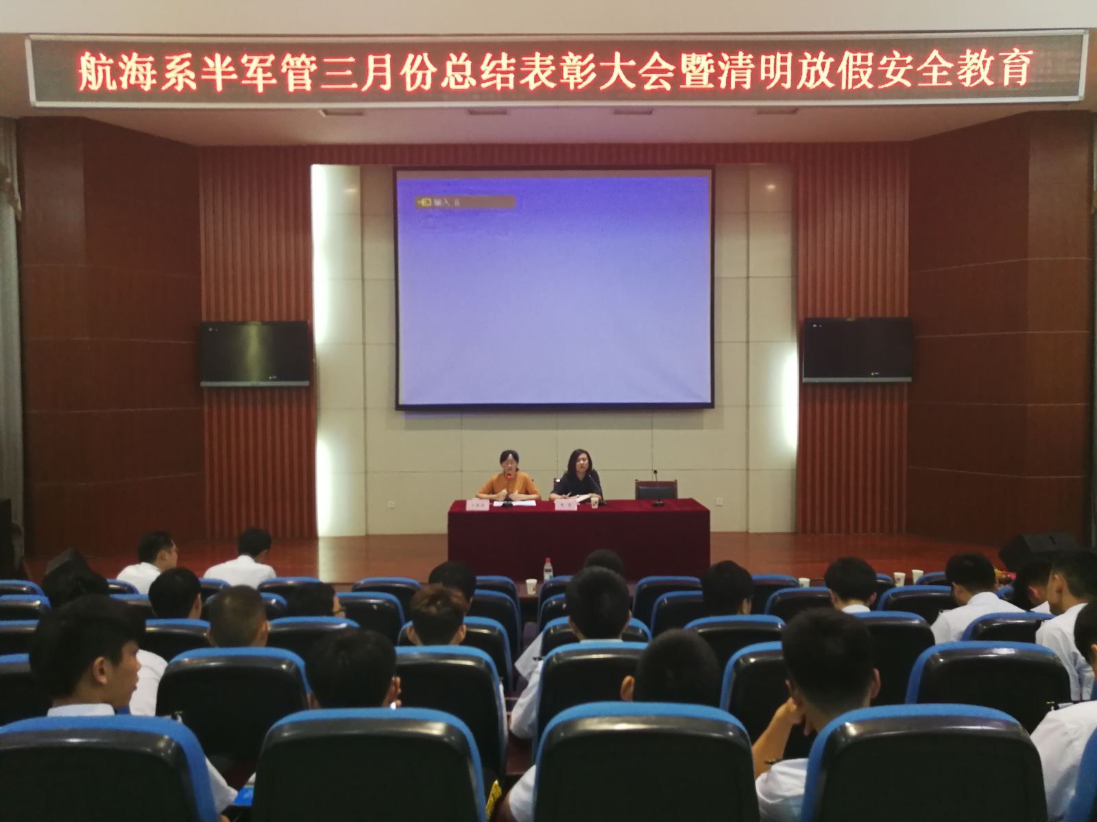 2018年4月3日,航海系在八角樓召開了半軍管三月份總結表彰大會暨清明假期安全教育大會,參加這次會議的有航海系黨支部書記朱蓉、學管老師、部分輔導員及15、16、17級全體學生。