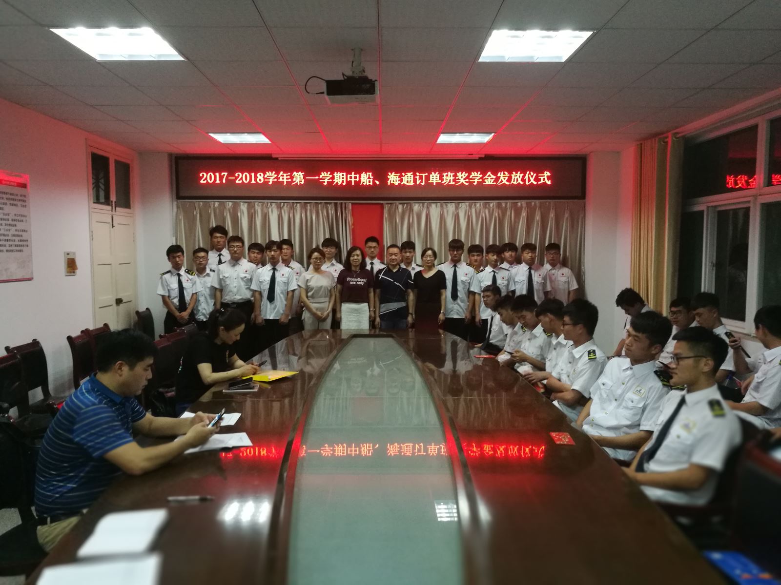 2018年6月26日,航海系舉行了2017-2018學年第一學期中船、海通訂單班獎學金發放儀式,參加本次頒獎儀式的有上海中船海員管理有限公司輪機長、副總經理陳華建,鹽城海通國際遠洋海員管理公司輪機長、經理張保安,人力資源部經理徐玉萍,系書記朱蓉,學管老師及全體訂單班學生。