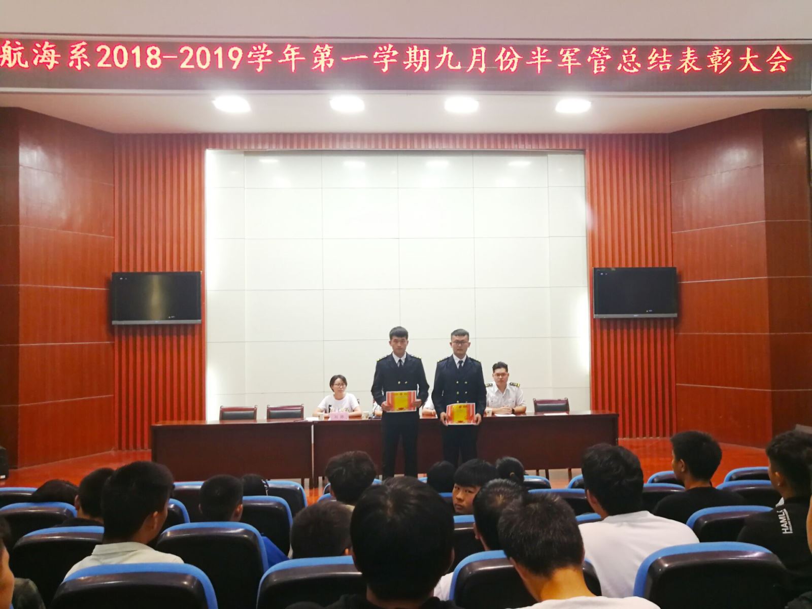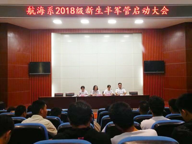 2018年 10月9日,航海系舉行了2018級(jí)新生半軍管啟動(dòng)大會(huì)暨9月總結(jié)表彰會(huì)。系黨支部書記朱蓉、系學(xué)管老師卜麗媛、劉婷及系全體學(xué)生參加了此次會(huì)議,會(huì)議由學(xué)管老師卜麗媛主持。
