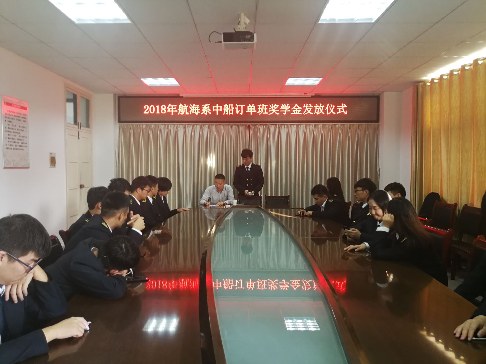 2018年10月24日,航海系舉行了2018航海系“海通訂單班獎(jiǎng)學(xué)金發(fā)放儀式”和“中船訂單班獎(jiǎng)學(xué)金發(fā)放儀式”,參加本次會(huì)議的有江蘇海洋船舶管理有限公司輪機(jī)長(zhǎng)張保安、人力資源部經(jīng)理徐玉萍、上海中船海員管理有限公司副總經(jīng)理陳華建,以及訂單班全體同學(xué)。