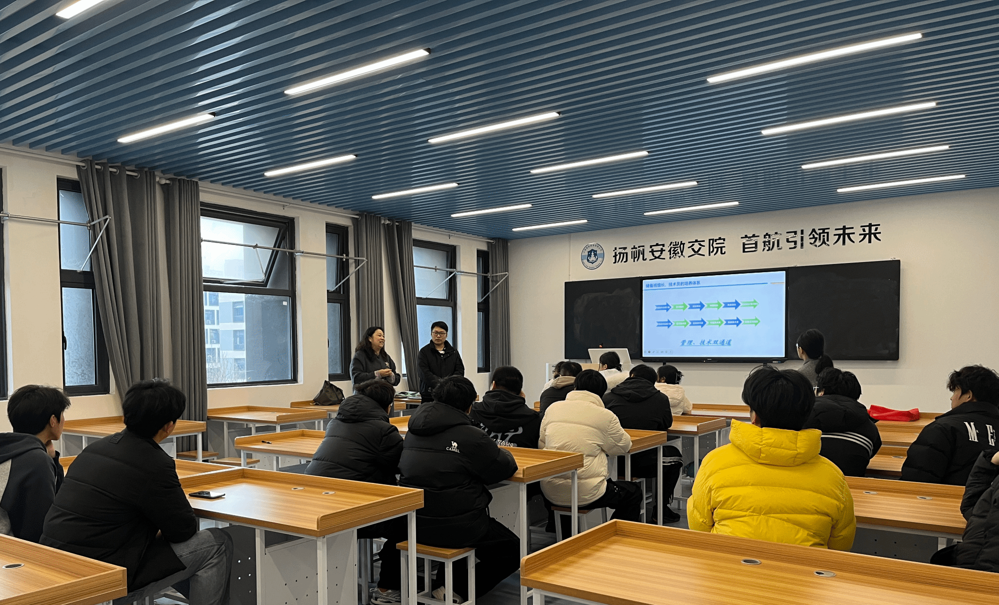 楊主管重點(diǎn)介紹了面向港口機(jī)械與智能控制專業(yè)的招聘崗位、任職要求、職業(yè)發(fā)展路徑及薪酬福利,并結(jié)合案例展示企業(yè)對(duì)新員工的培養(yǎng)機(jī)制?,F(xiàn)場(chǎng)同學(xué)積極互動(dòng),就崗位內(nèi)容、實(shí)習(xí)安排等問題踴躍提問,楊主管逐一耐心解答。