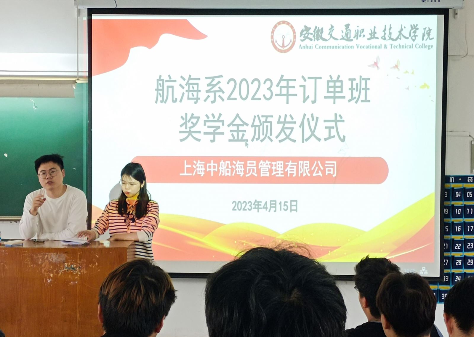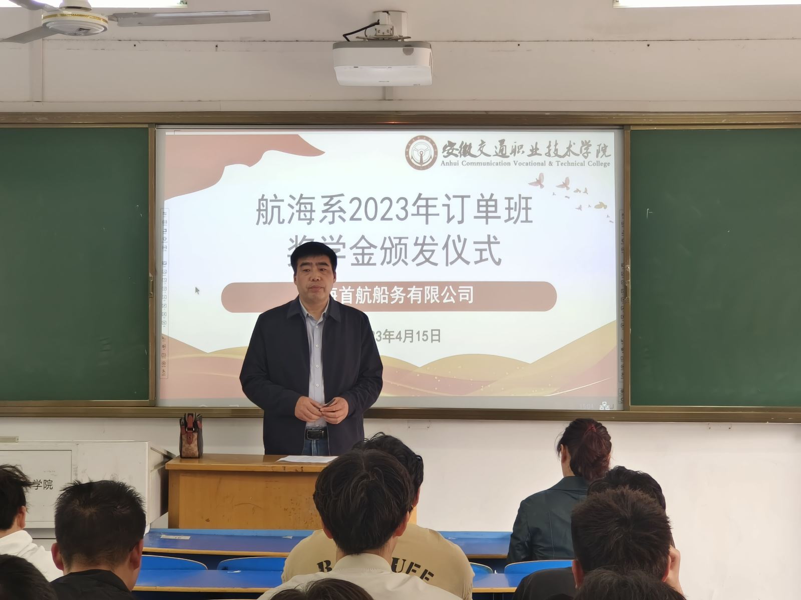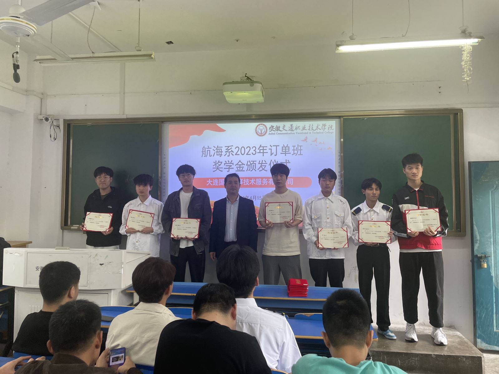 4月15日,航海系舉行訂單班企業獎學金頒發儀式,中遠海運船員管理有限公司天津分公司劉長船長、大連國合海事技術服務有限公司畢崇峰船長、上海首航船務有限公司張保安輪機長、上海中船海員管理有限公司船員調度主管高江皓,航海系領導班子、學生管理老師、輔導員,以及全體訂單班學生參加了儀式。