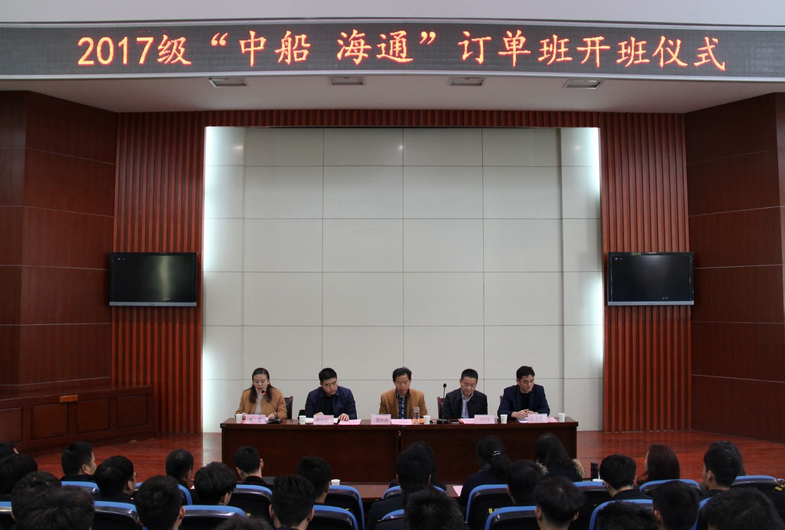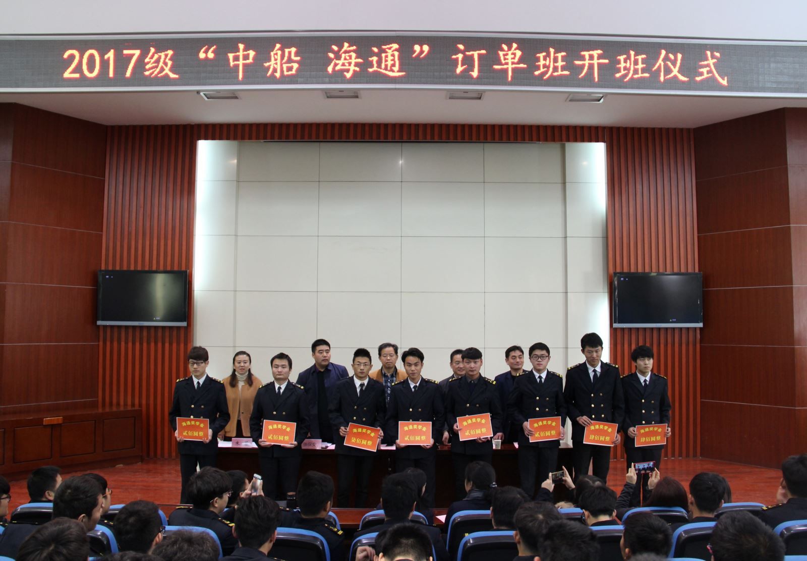 11月25日下午,水運工程系在多功能報告廳舉行2017級”中船 海通”訂單班開班儀式。系領導、教研室主任、辦公室主任、船員培訓中心主任及新生班輔導員到場。上海中船海員管理有限公司、鹽城海通國際遠洋船務有限公司及上海鶴圣船舶科技有限公司相關人員出席。