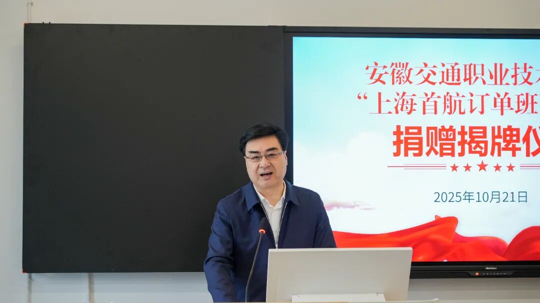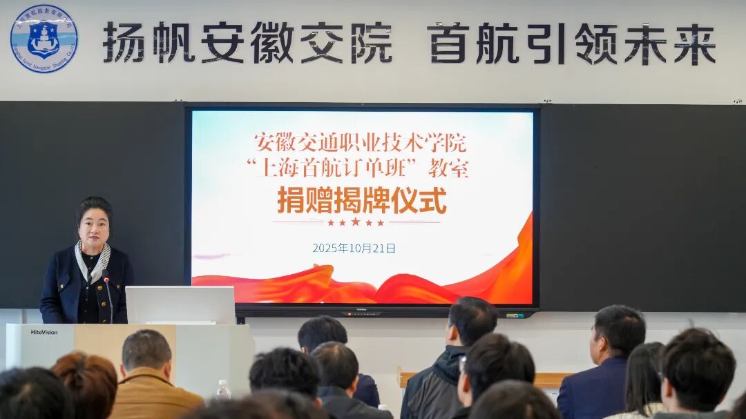 10月21日上午,安徽交通職業技術學院“上海首航訂單班”教室捐贈揭牌儀式在云帆樓311順利舉行。上海市虹口區人大代表、上海首航船務有限公司董事長韓朝林、校黨委副書記、校長孫曉雷出席儀式,企業代表、航運工程學院領導師生代表共計六十余人參加儀式。儀式由校黨委委員、副校長梁洪波主持。