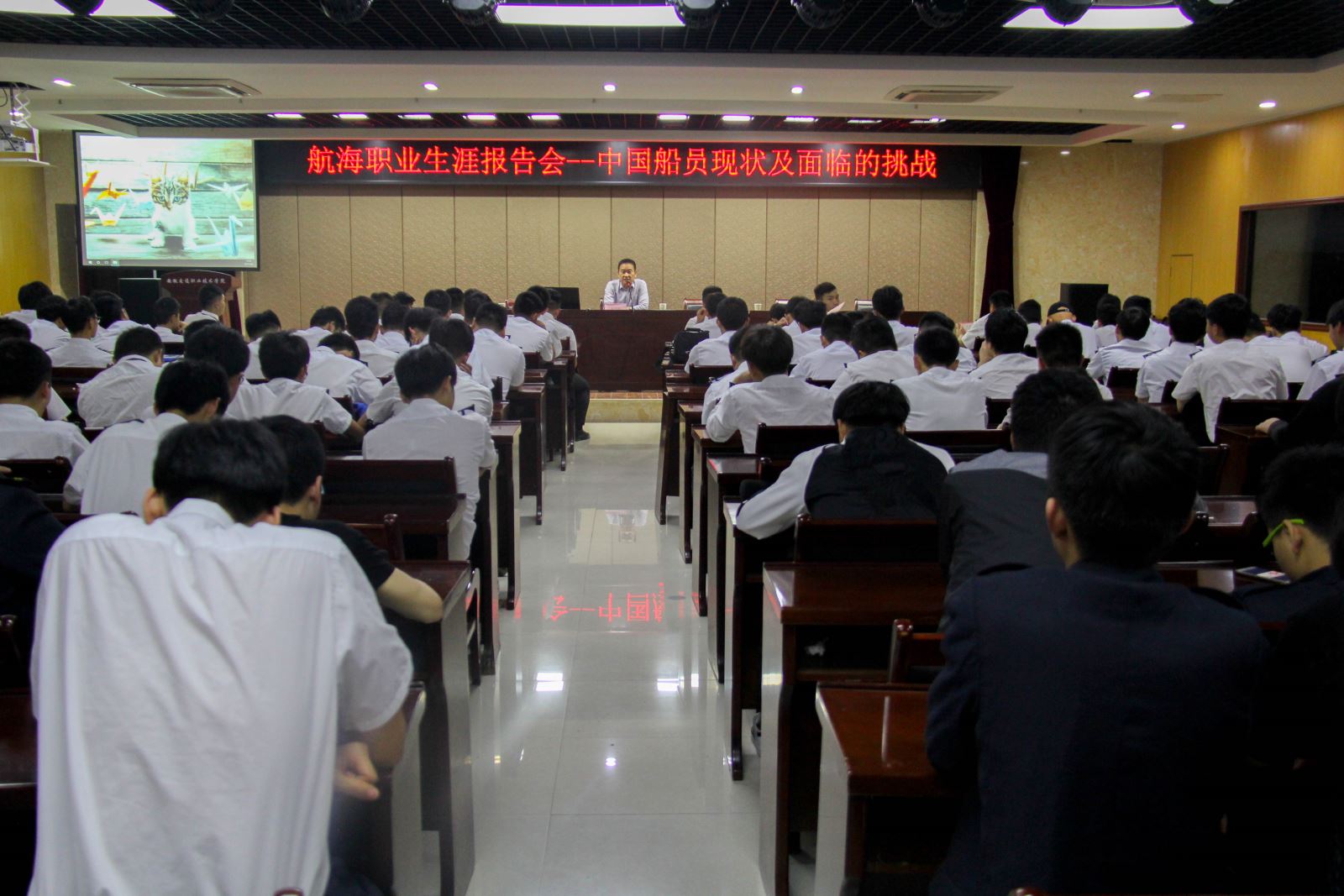 會議結束之后,上海中船船務管理有限公司陳華健輪機長為同學們做專題報告。陳老軌與同學們進行親切交談,結合自身經歷對未來航運業的發展及航運人才的培養表達了自己的見解,堅信航運業會很快走出瓶頸期,希望同學們能夠認真學習,成為新一代高級航運人才。