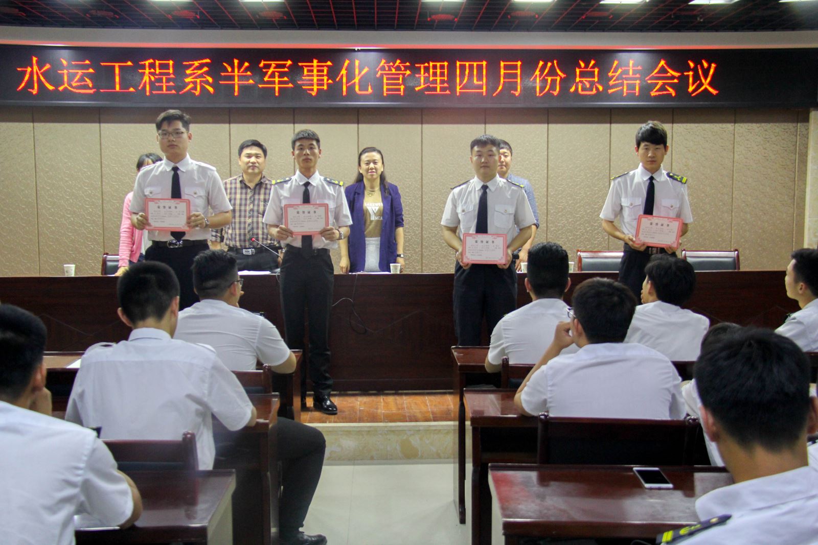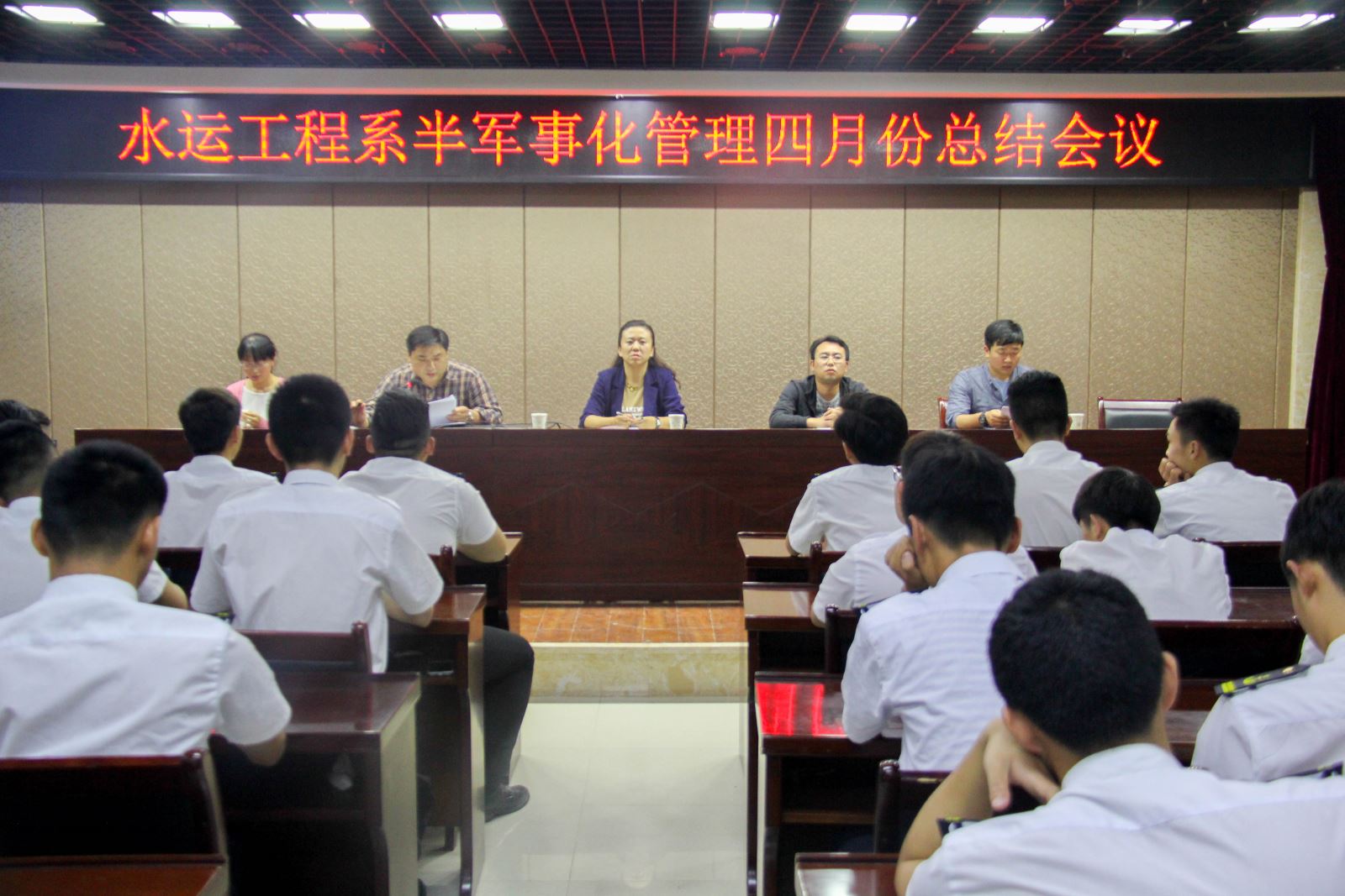 2017年5月8日晚,水運工程系在大學生活動中心二樓報告廳召開半軍管四月總結會議。系黨支部書記朱蓉、團總支書記劉超、教學秘書張峰、學管辦老師朱宸、卜麗媛以及系全體學生出席會議。