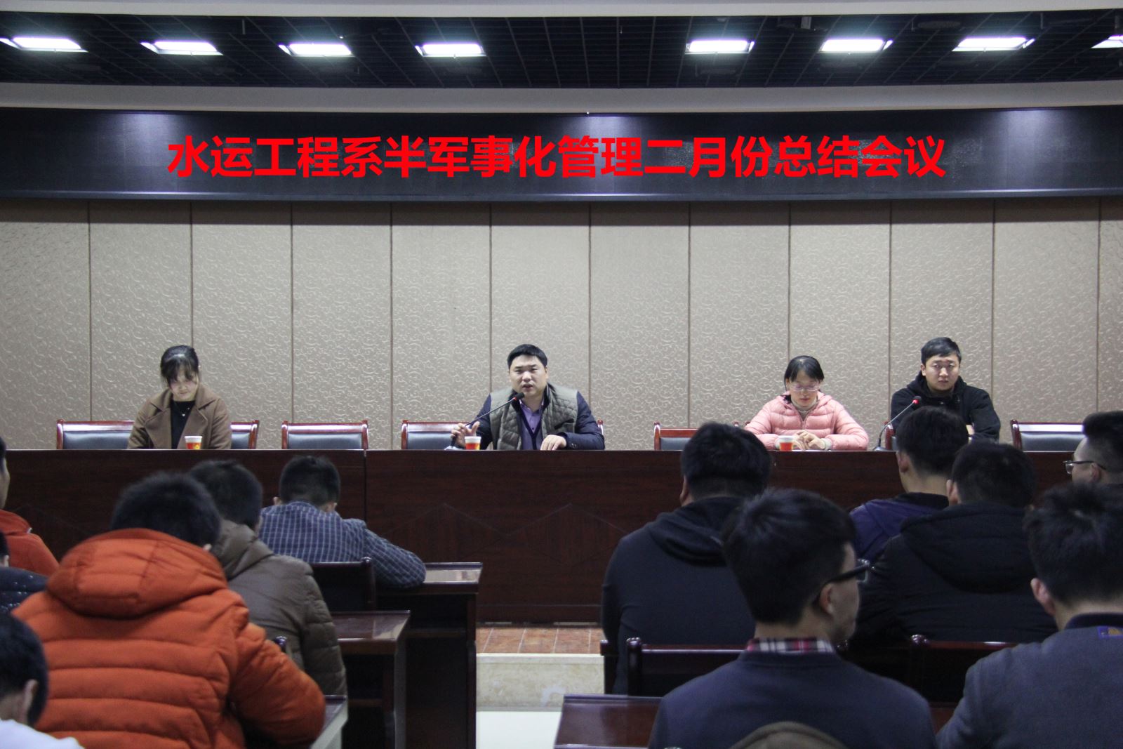 3月2日晚,水運工程系2017年半軍事化管理二月份總結大會在大學生活動中心二樓報告廳召開。團總支書記劉超、學管辦老師朱宸、卜麗媛、李蓓以及水運工程系全體學生出席了此次大會。會議由劉超老師主持。