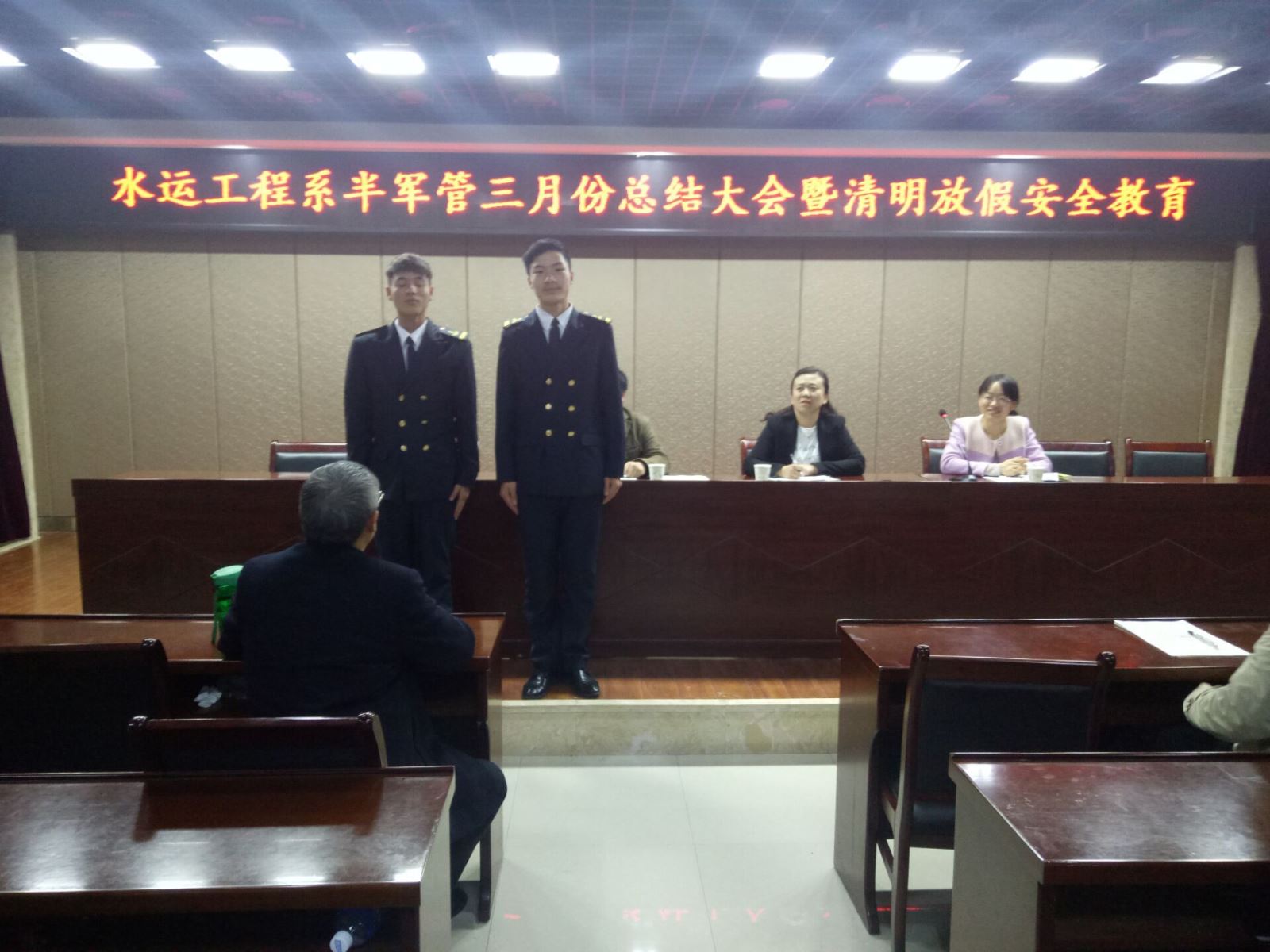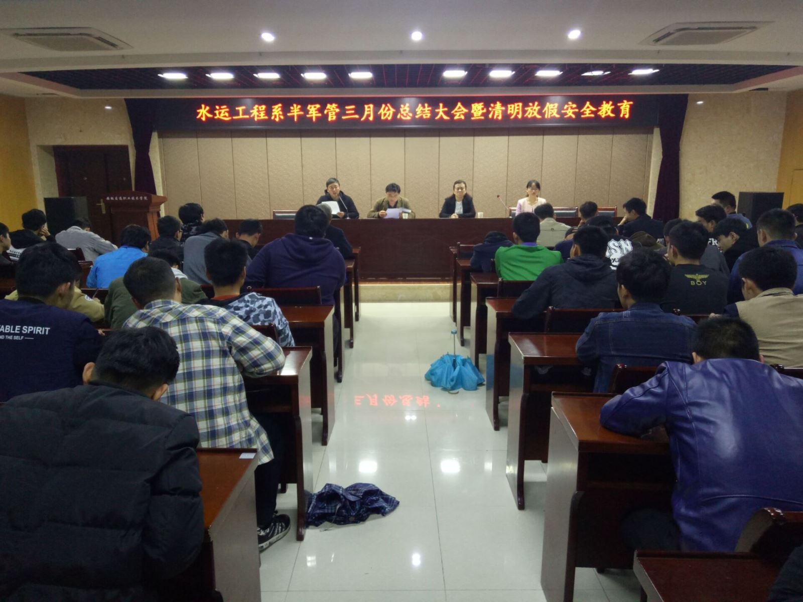 2017年3月30日晚,水運工程系在大學(xué)生活動中心二樓報告廳召開水運工程系半軍管三月總結(jié)暨清明假期安全教育會議。系黨支部書記朱蓉、團總支書記劉超、學(xué)管辦老師朱宸、卜麗媛、15航二輔導(dǎo)員梁金華以及系全體同學(xué)出席會議。