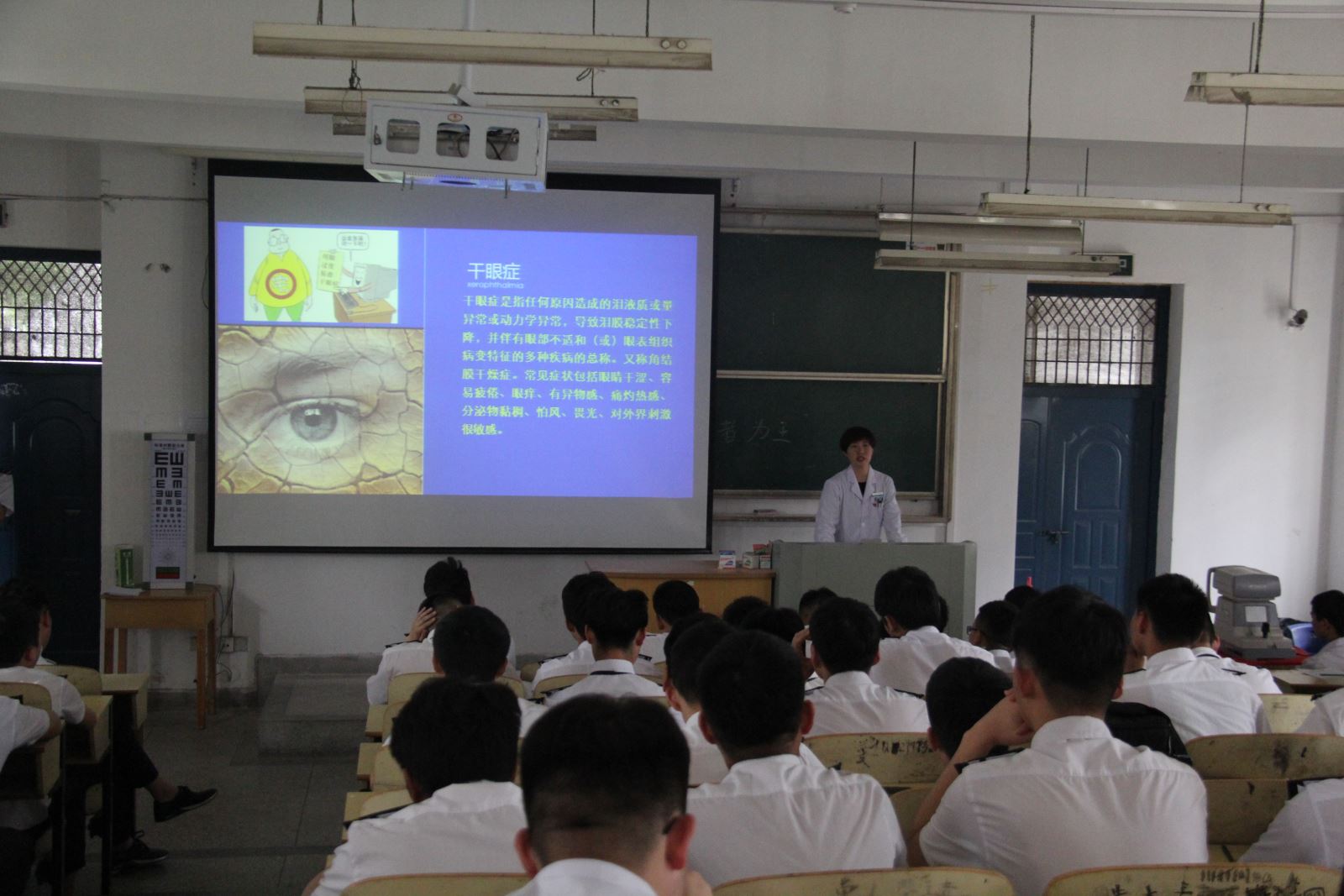 活動開始,愛爾眼科醫院陳誠醫師進行了一場生動的眼健康知識講座,詳細了解近視學生的人數,接著說明了近視的原因、后果及如何進行矯正。同學們認真聽講,積極地做出回應,陳醫師親切的回答同學們提出的問題,講座氣氛其樂融融。