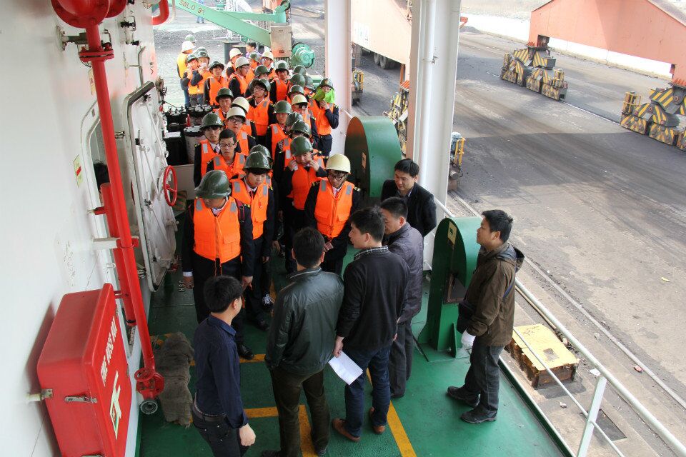 2014年3月26日,在系黨支部書記朱蓉老師的帶領下,14級全體學生赴揚州市江都港“太行128”散貨船上認知實習。