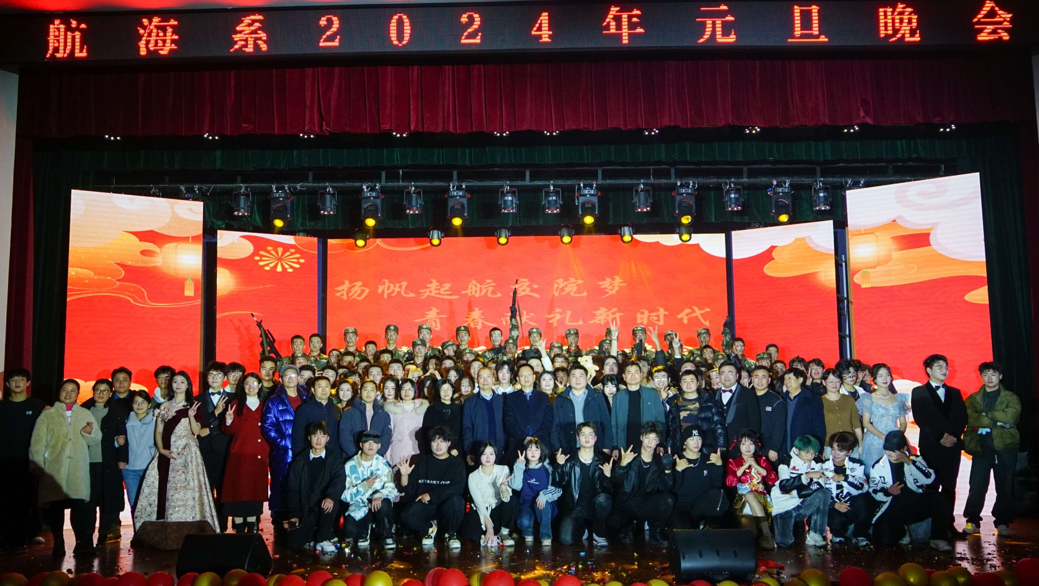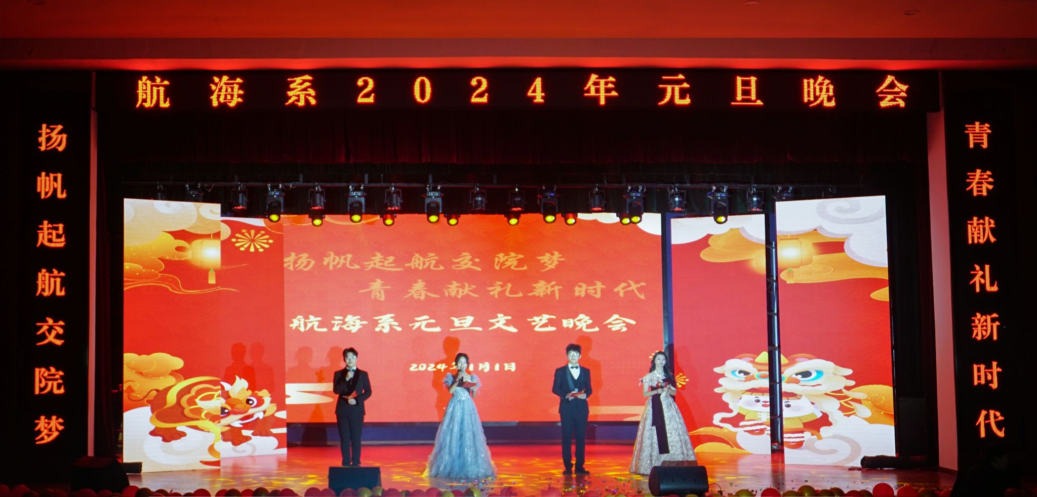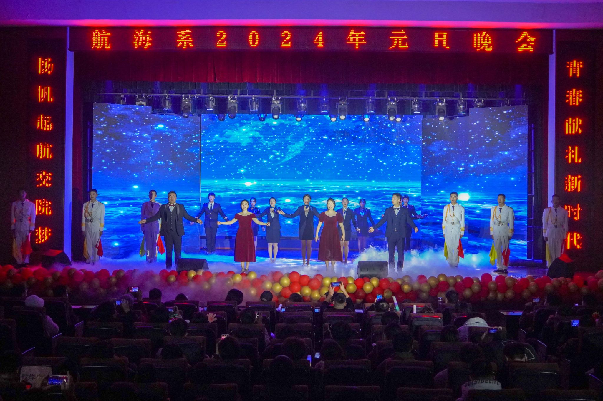 玉兔辭舊春華起,龍騰新春氣象新。1月1日晚,航海系2024年“揚帆起航交院夢 青春獻禮新時代”元旦聯歡晚會在南區大禮堂隆重舉行。學院黨委副書記楊菲鈴,學院黨委委員、副院長韋兵,學生處副處長、院團委書記劉元元,系領導班子,同廣大師生帶著對新一年的美好期盼歡聚一堂,共同觀看晚會。