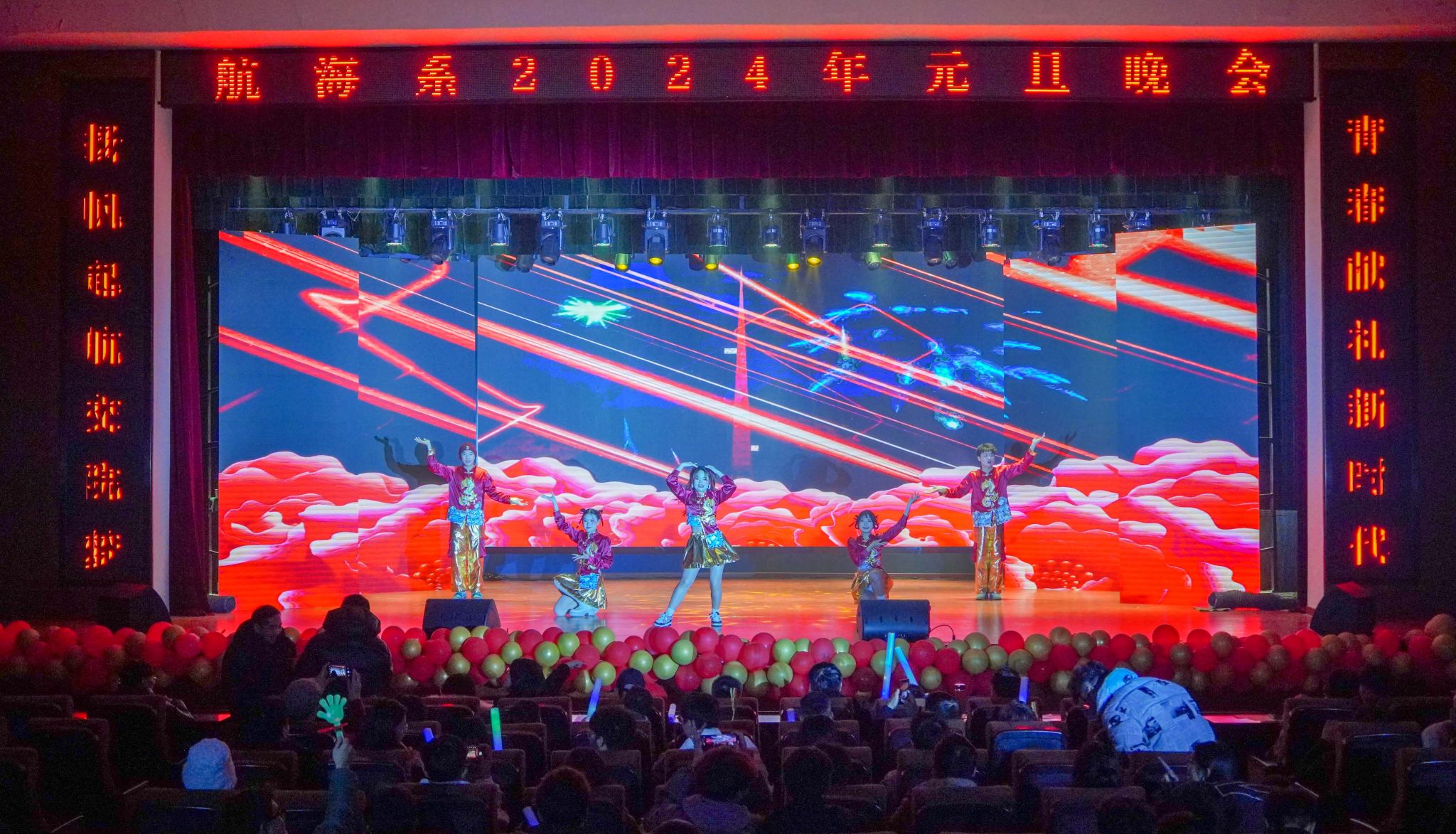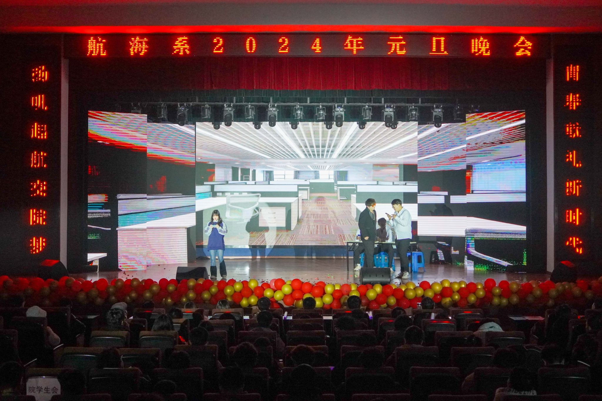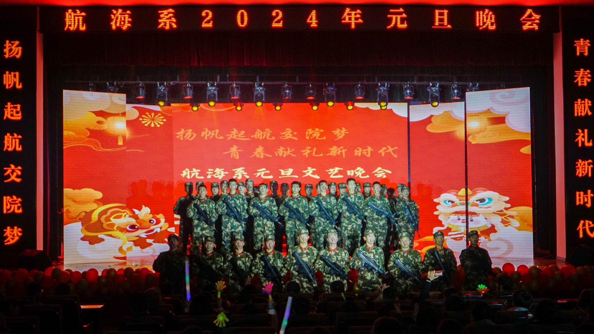 玉兔辭舊春華起,龍騰新春氣象新。1月1日晚,航海系2024年“揚帆起航交院夢 青春獻禮新時代”元旦聯歡晚會在南區大禮堂隆重舉行。學院黨委副書記楊菲鈴,學院黨委委員、副院長韋兵,學生處副處長、院團委書記劉元元,系領導班子,同廣大師生帶著對新一年的美好期盼歡聚一堂,共同觀看晚會。
