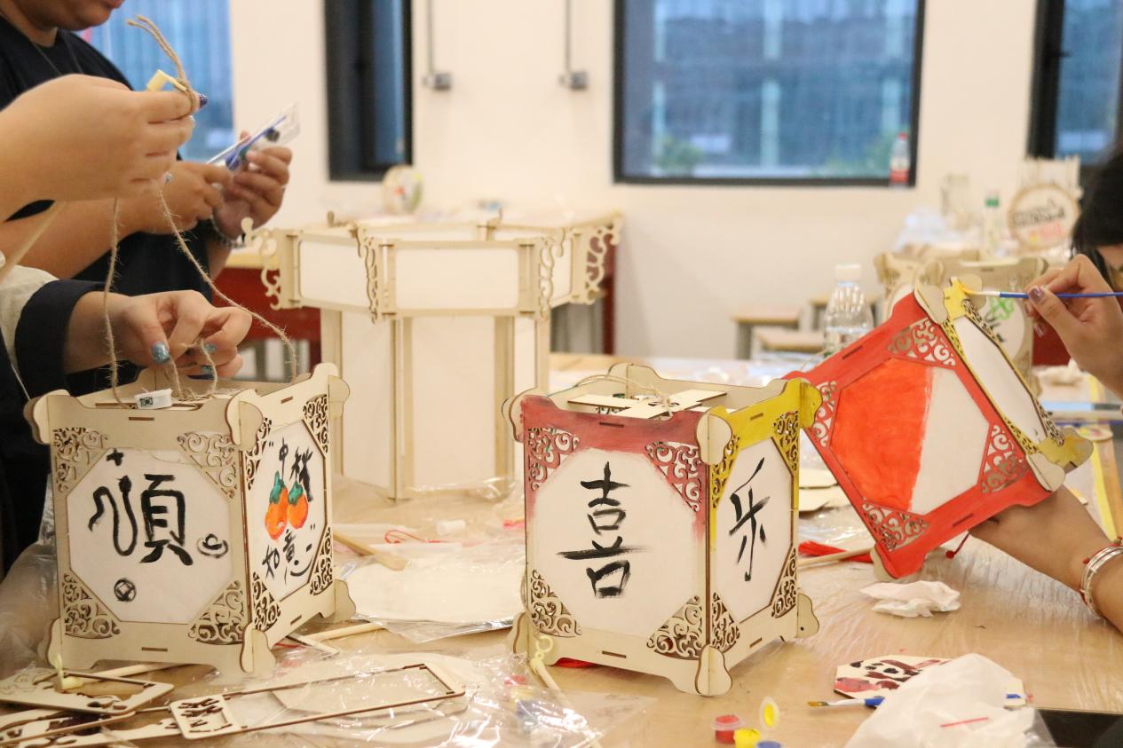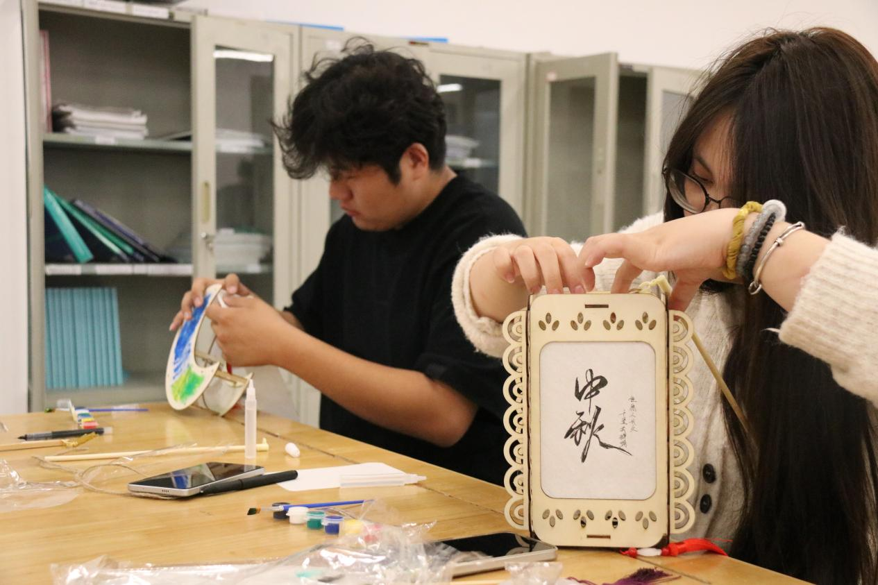 活動(dòng)現(xiàn)場(chǎng),木質(zhì)燈籠組件、顏料、宣紙、扇骨等材料整齊擺放,在溫暖燈光的映照下,處處洋溢著濃厚的節(jié)日氛圍。在木質(zhì)燈籠制作環(huán)節(jié),同學(xué)們首先通過教學(xué)視頻,系統(tǒng)了解了傳統(tǒng)燈籠的文化寓意、拼接技巧以及榫卯結(jié)構(gòu)的對(duì)齊與固定方法,加深了對(duì)燈籠制作工藝的理解。隨后,大家分組協(xié)作,手持木件耐心拼接,彼此交流制作心得——“這里要卡緊”“這里加點(diǎn)顏色會(huì)更生動(dòng)”。原本零散的部件在歡聲笑語中逐漸成型,系上繩結(jié)、掛上流蘇,最后點(diǎn)亮燈芯。一盞盞承載巧思的燈籠透出溫暖光芒,映照出每個(gè)人臉上滿足的笑容。