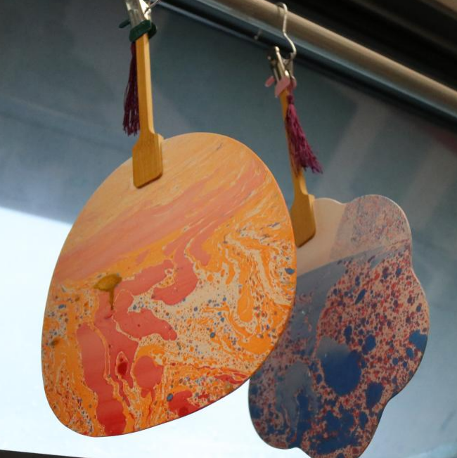 團(tuán)扇浸染區(qū)同樣氣氛熱烈。同學(xué)們發(fā)揮創(chuàng)意,將染料輕點(diǎn)于水面,以小棍勾勒出細(xì)膩紋樣,再將素白扇面勻速浸入水中。待圖案均勻附著后,輕輕取出晾干。一把把五彩斑斕的團(tuán)扇在微風(fēng)中輕搖,每一抹色彩都凝聚著同學(xué)們對(duì)美的獨(dú)特理解與大膽嘗試。大家在親手創(chuàng)作的過程中,也深切感受到非遺技藝的獨(dú)特魅力。