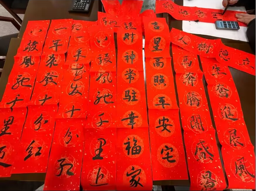 一幅幅筆力遒勁的春聯、一個個喜慶飽滿的“福”字漸次呈現。“書山探秘躬行早,學海泛舟志氣高”“乘風破浪航運志,緯地經天報國情”“桃李迎春芳滿院,芝蘭競秀喜盈門”……工整對仗的文字承載著真摯的新春祝福,剛健灑脫的筆觸展現著傳統文化的深厚魅力。