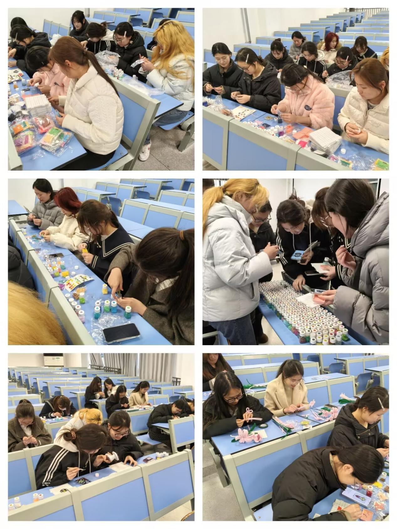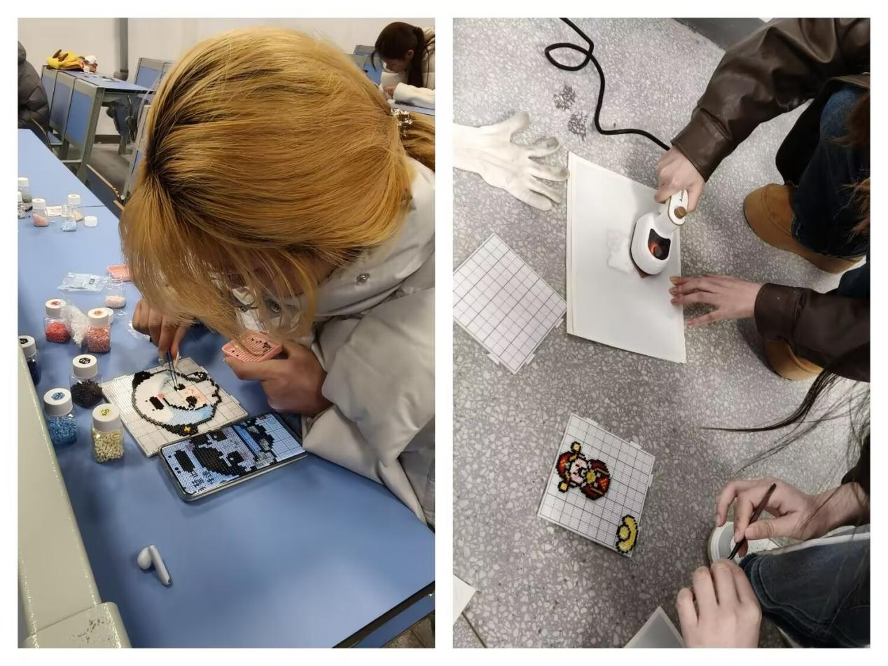 創作過程中,大家圍坐在一起,互相交流靈感、分享技巧,在專注與協作中放松身心、釋放壓力。有人對照圖案細致拼搭,有人隨性發揮自由創作。每一顆豆粒的擺放、每一次扭棒的纏繞,都傾注著對生活的熱愛與對自我的表達。當零散的拼豆在熨燙機的溫度下凝結成完整的作品,當柔軟的扭扭棒被塑造成精美的裝飾,女生們手捧自己的勞動成果,臉上洋溢著滿滿的成就感與幸福感。