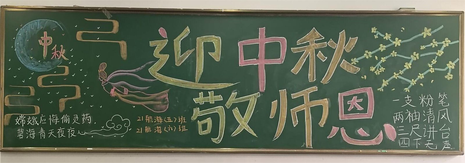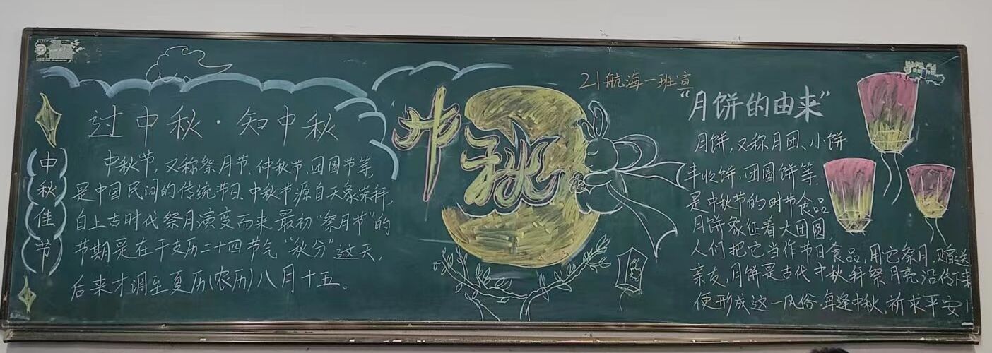 在教師節和中秋節雙節來臨之際,為進一步繼承和發揚傳統文化,豐富校園文化內涵,弘揚尊師重教美德,航海系團總支組織開展了以“迎中秋,敬師恩”為主題的黑板報評比活動。