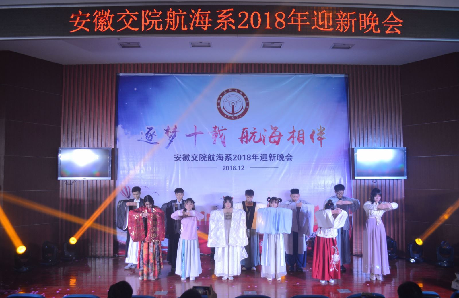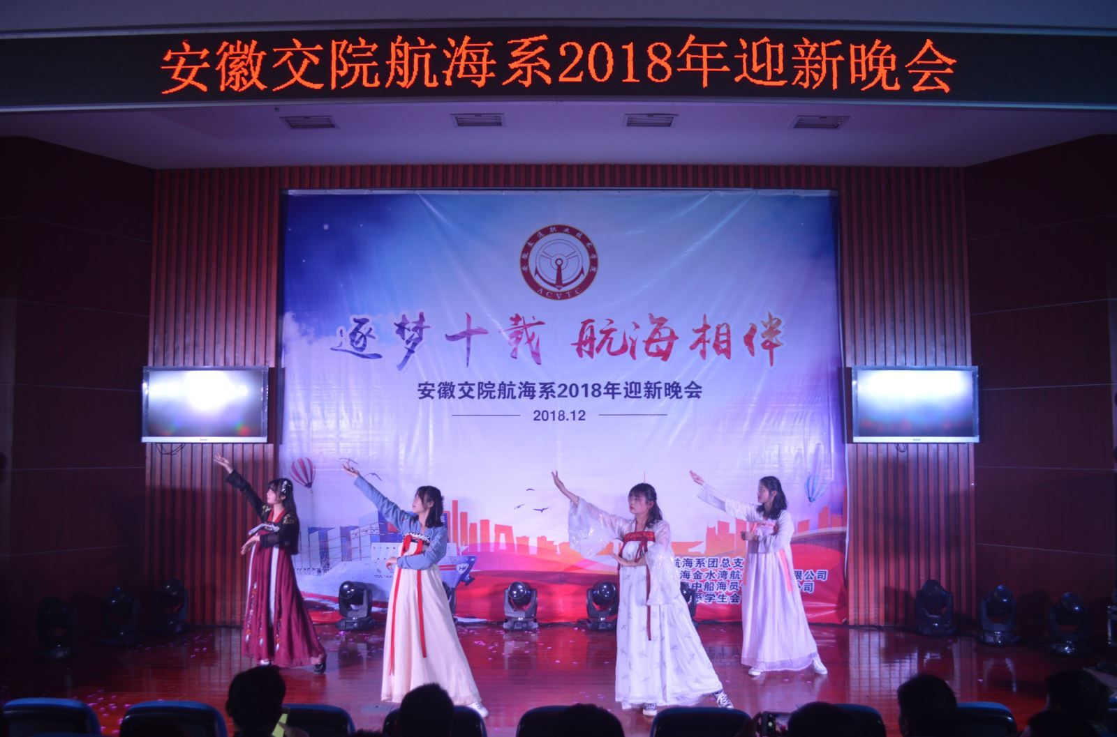 12月16日晚,由航海系團(tuán)總支、上海金水灣航運(yùn)發(fā)展有限公司、上海中船海員管理有限公司主辦,航海系學(xué)生會承辦的2019年迎新晚會在八角樓開幕。合作企業(yè)中船公司陳華建輪機(jī)長、金水灣公司張保安輪機(jī)長出席并祝詞。院紀(jì)委書記陳明、航海系主任雷長森、系支部書記朱蓉及師生們共同觀看了晚會。