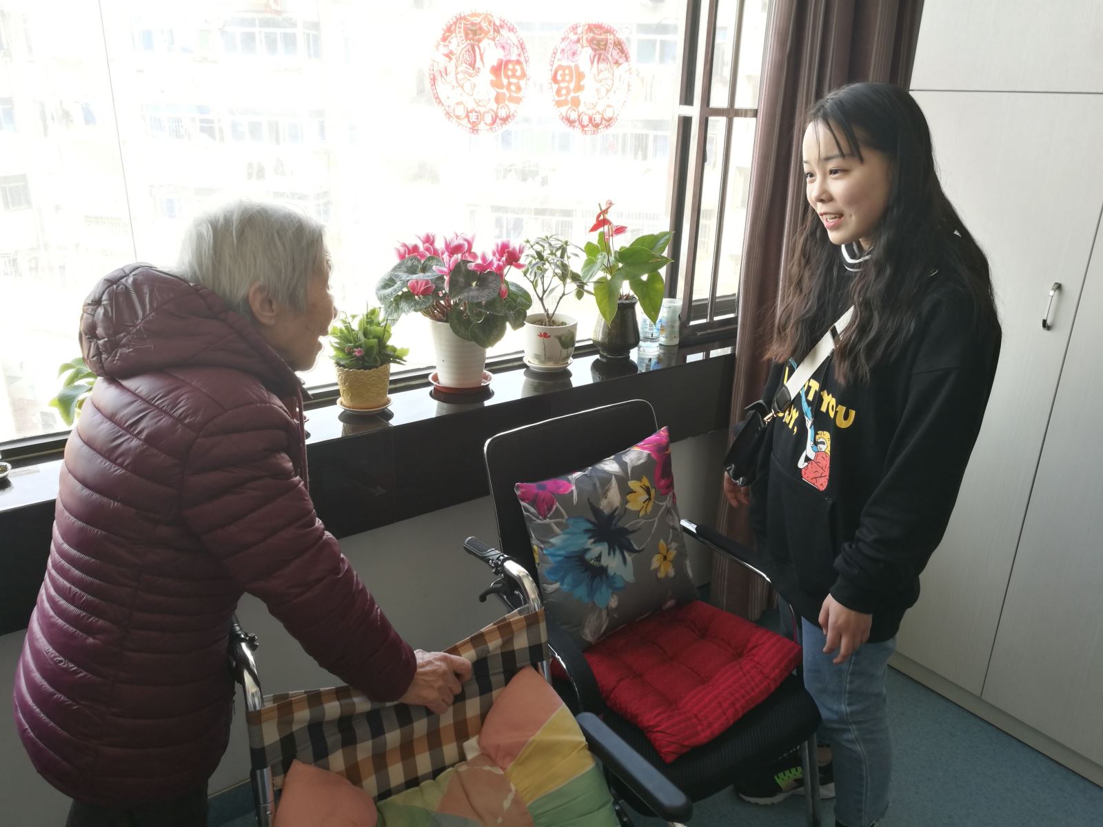 我校志愿者們帶著關(guān)心,帶著祝愿,帶著為老人們精心準(zhǔn)備的禮品來到敬老院。到達(dá)老年公寓后,院長(zhǎng)及工作人員熱情的接待了志愿者們。在老年公寓里,青年志愿者們分成了若干小組,分別去每位老人的房間里,與老人聊天談心,親切交流,并幫助老人們整理房間、打掃衛(wèi)生。