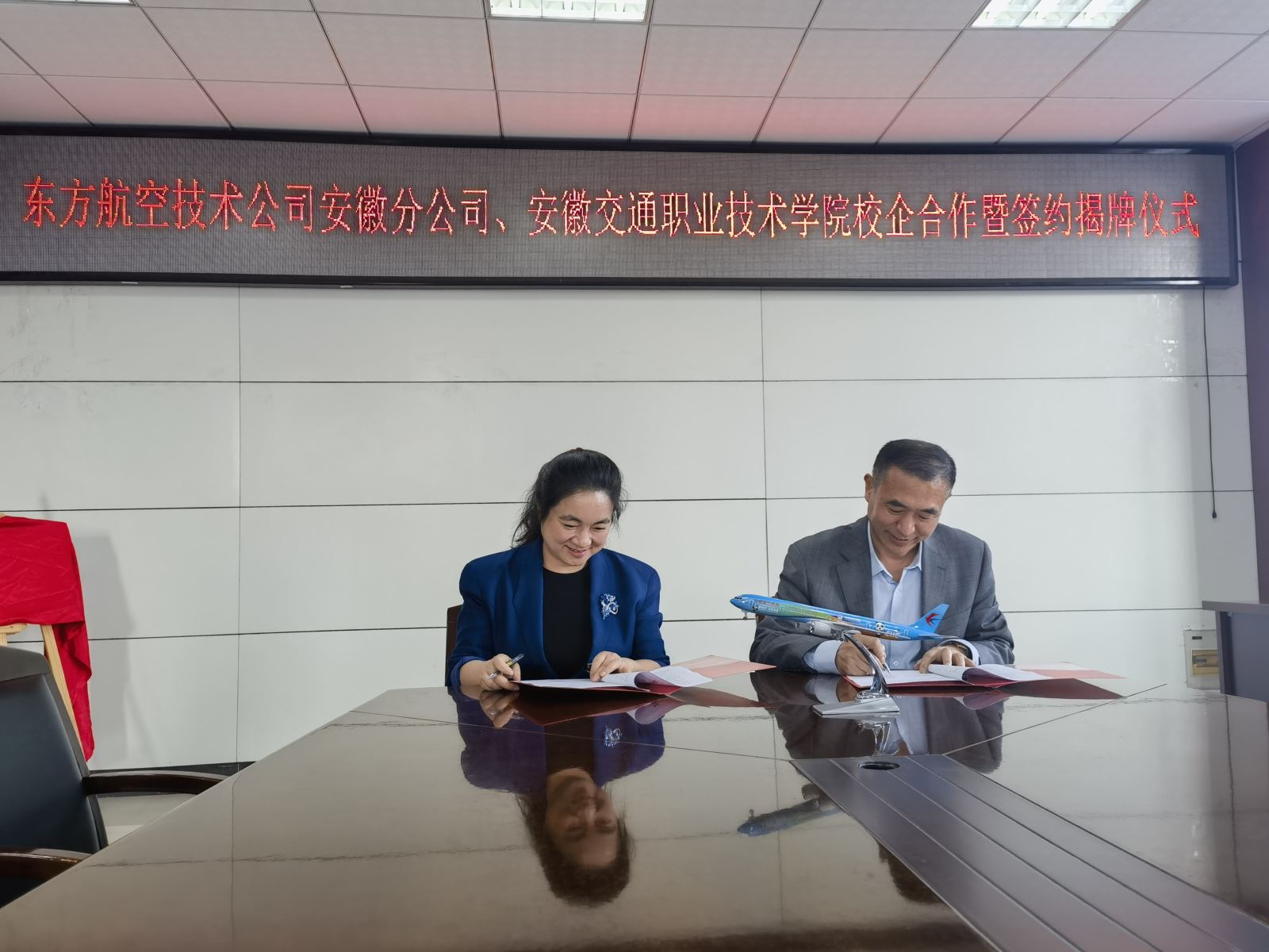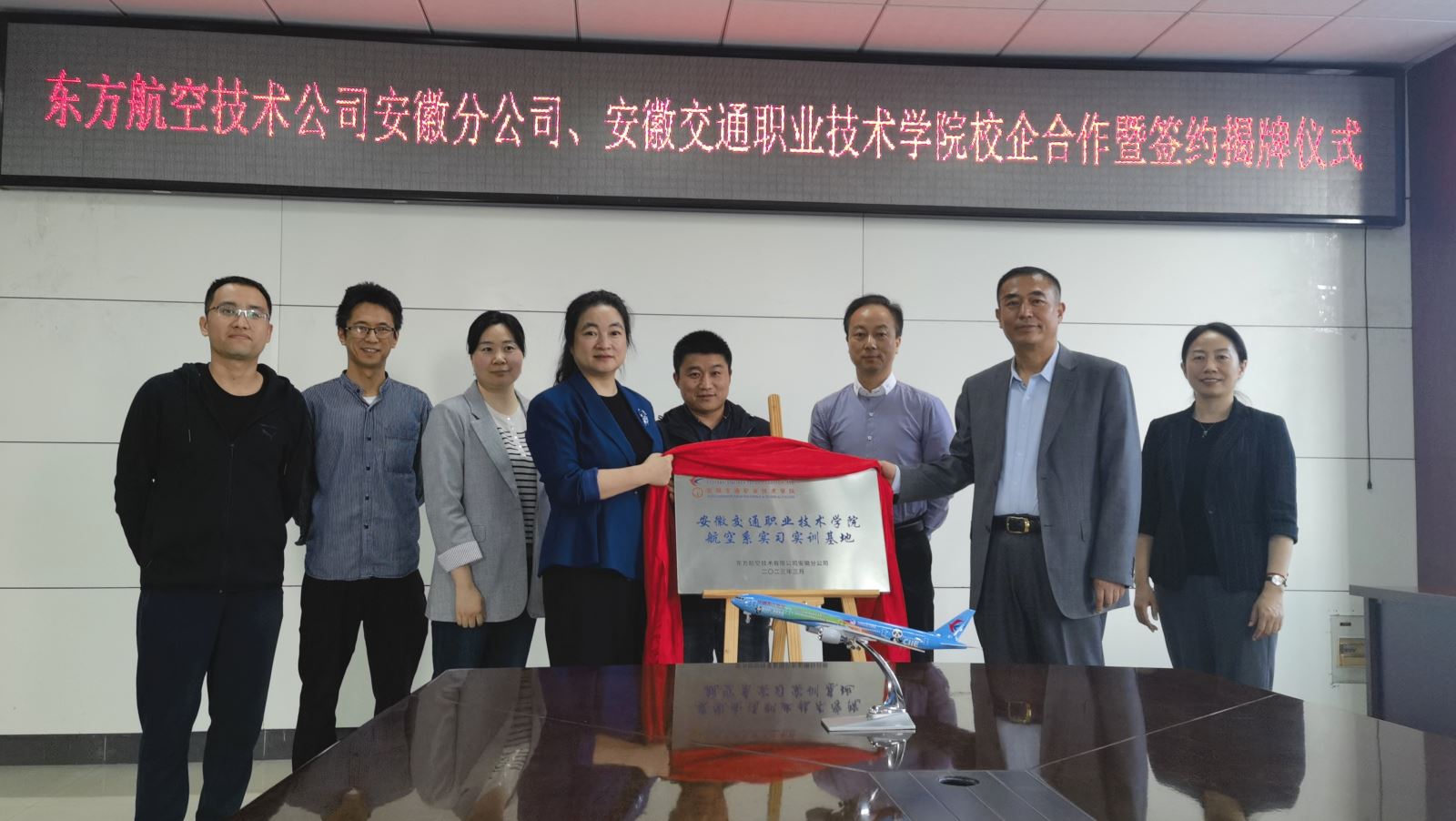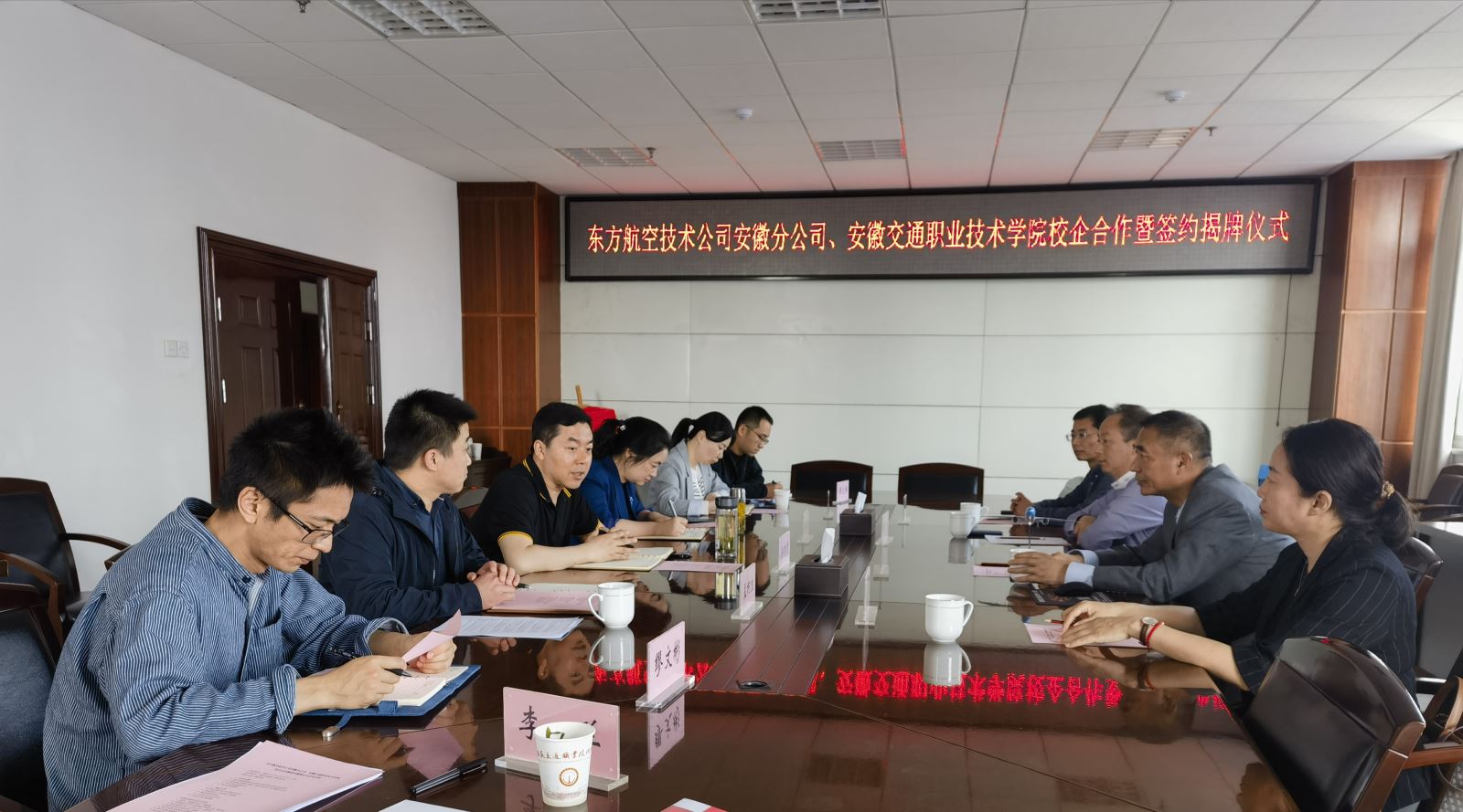 5月12日下午,安徽交通職業技術學院與東方航空技術有限公司安徽分公司在信息樓七樓會議室舉行校企合作暨簽約揭牌儀式,東方航空技術有限公司安徽分公司黨委書記、總經理肖俊峰,副總經理陳亮,安徽交通職業技術學院院長孫曉雷,黨委委員、汽車與機械工程系主任梁洪波出席簽約儀式。