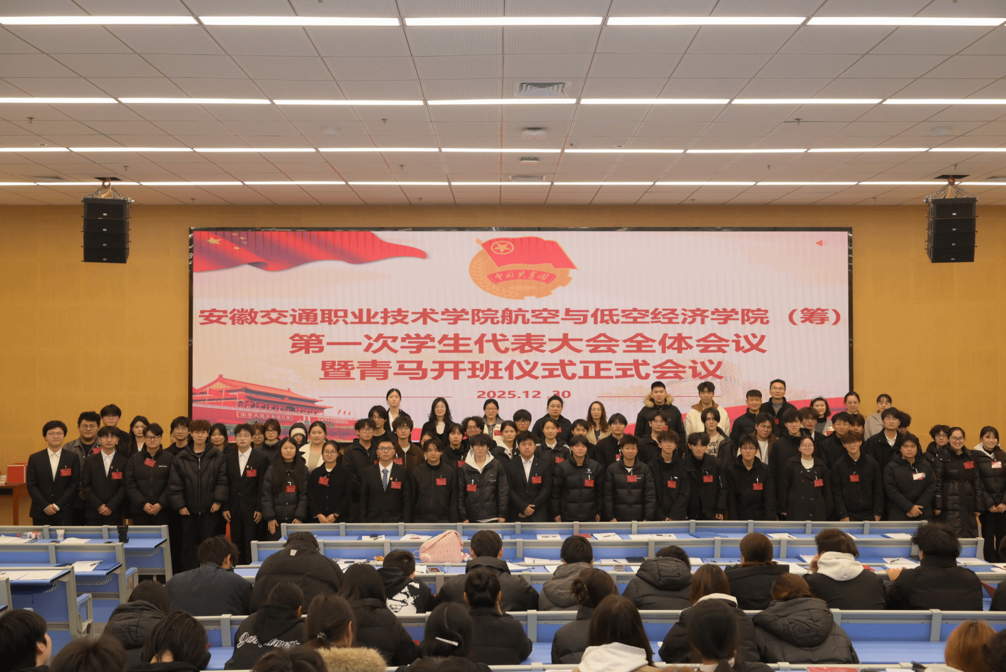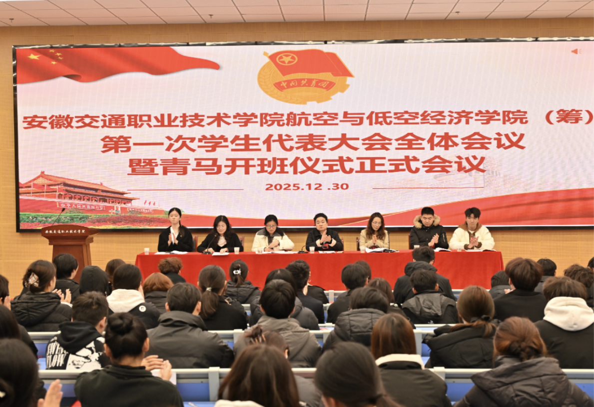 2025年12月30日下午,安徽交通職業技術學院航空與低空經濟學院(籌)第一次學生代表大會暨“青馬工程”開班儀式在莊嚴的國歌聲中開幕。大會以“弘揚二十大精神,爭做新時代青年”為主題,來自全院各年級、專業的55名學生代表參會。學院黨支部相關領導出席開幕式。