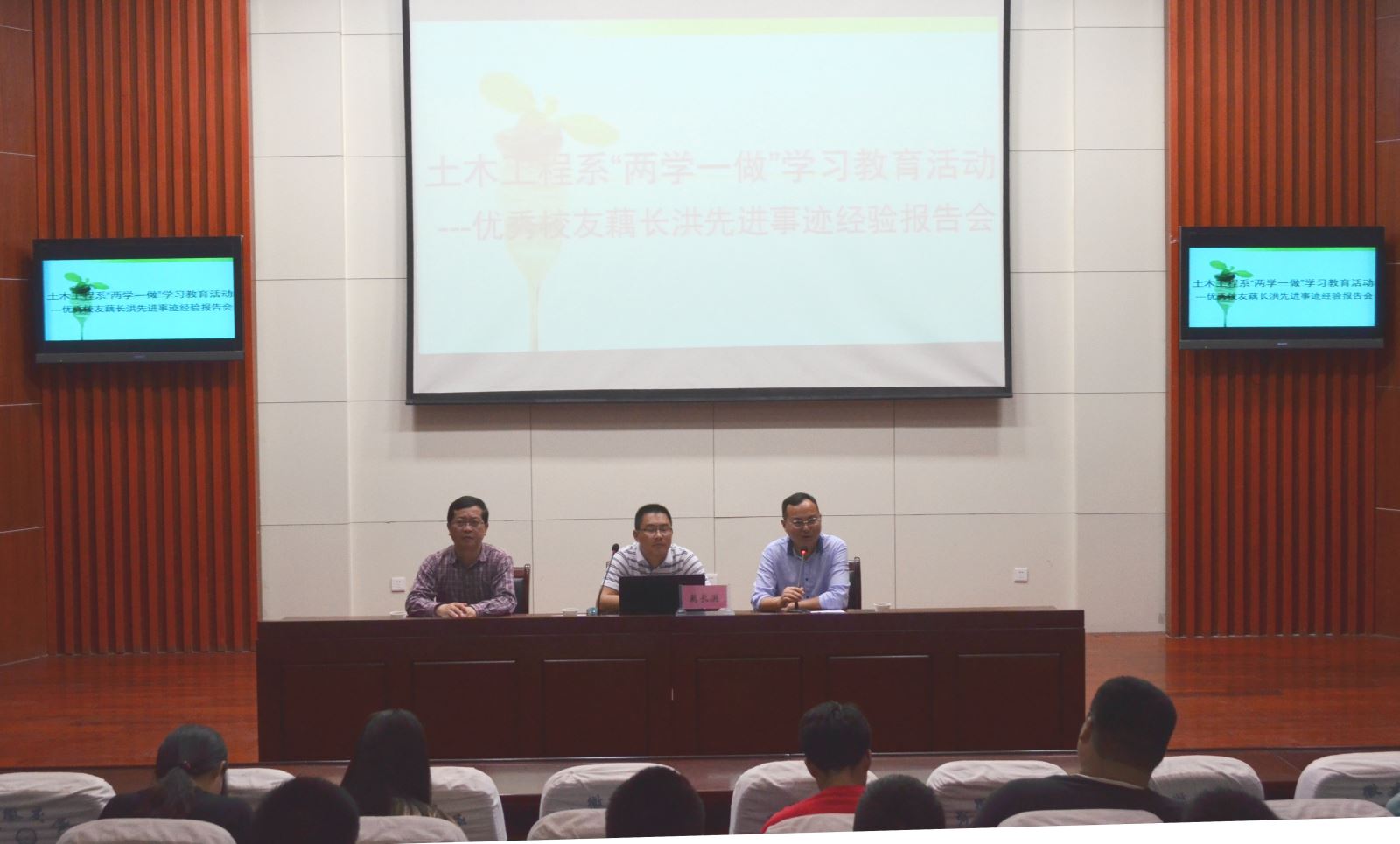 為推動“兩學一做”學習教育扎實開展,營造學習教育濃厚氛圍,6月5日晚7點,土木工程系“兩學一做”學習教育—優秀校友藕長洪先進事跡報告會在北區多功能報告廳舉行,邀請了全國“五一勞動獎章”獲得者、2015年全國最美青工,國家特殊津貼專家,中鐵大橋局7公司試驗公司經理、我院2005屆優秀校友藕長洪與全系學生黨員、入黨積極分子和部分學生分享學習、工作經驗,幫助學弟學妹們樹立理想信念,走好人生道路。
