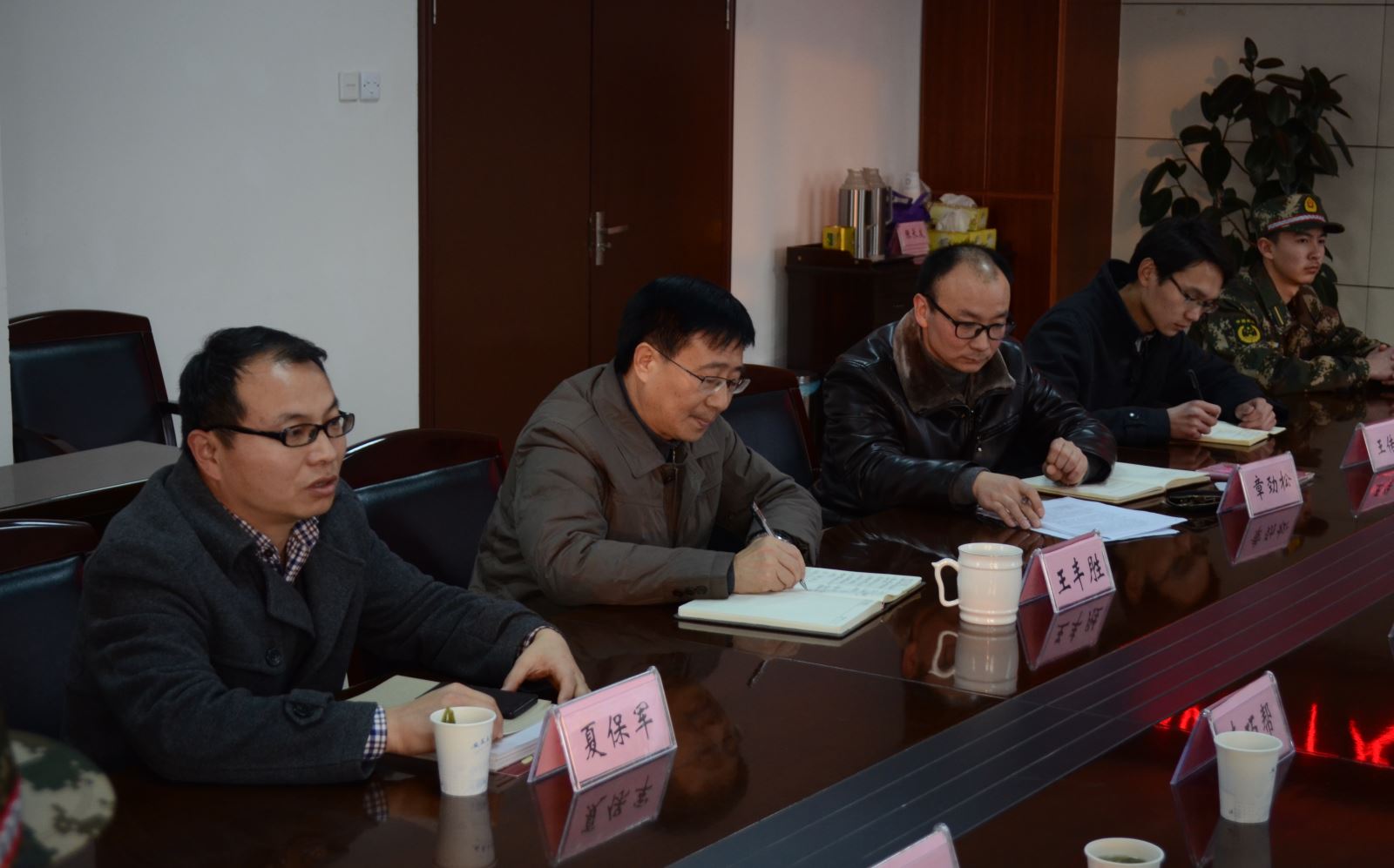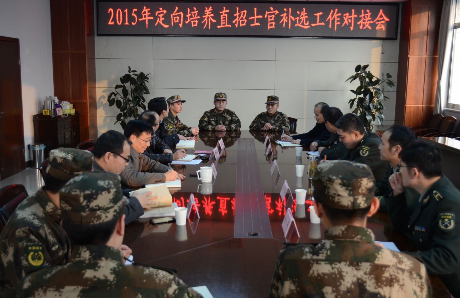 12月30日下午,學院2015年定向培養直招士官補選工作會議在北區信息樓七樓會議室召開。省軍區司令部保密檔案室主任王昊、合肥市包河區武裝部副部長劉春、省軍區司令部軍務動員處參謀朱軍、武警交通第八支隊副參謀長李巧幫和學院副院長王豐勝出席會議。教務處副處長(主持工作)章勁松主持會議。