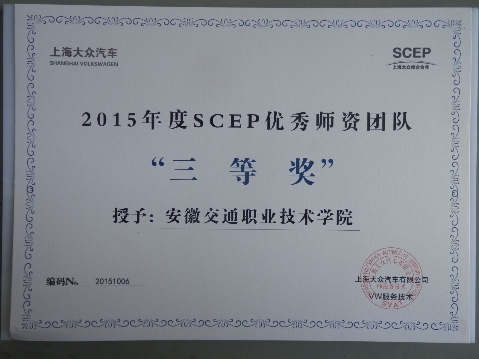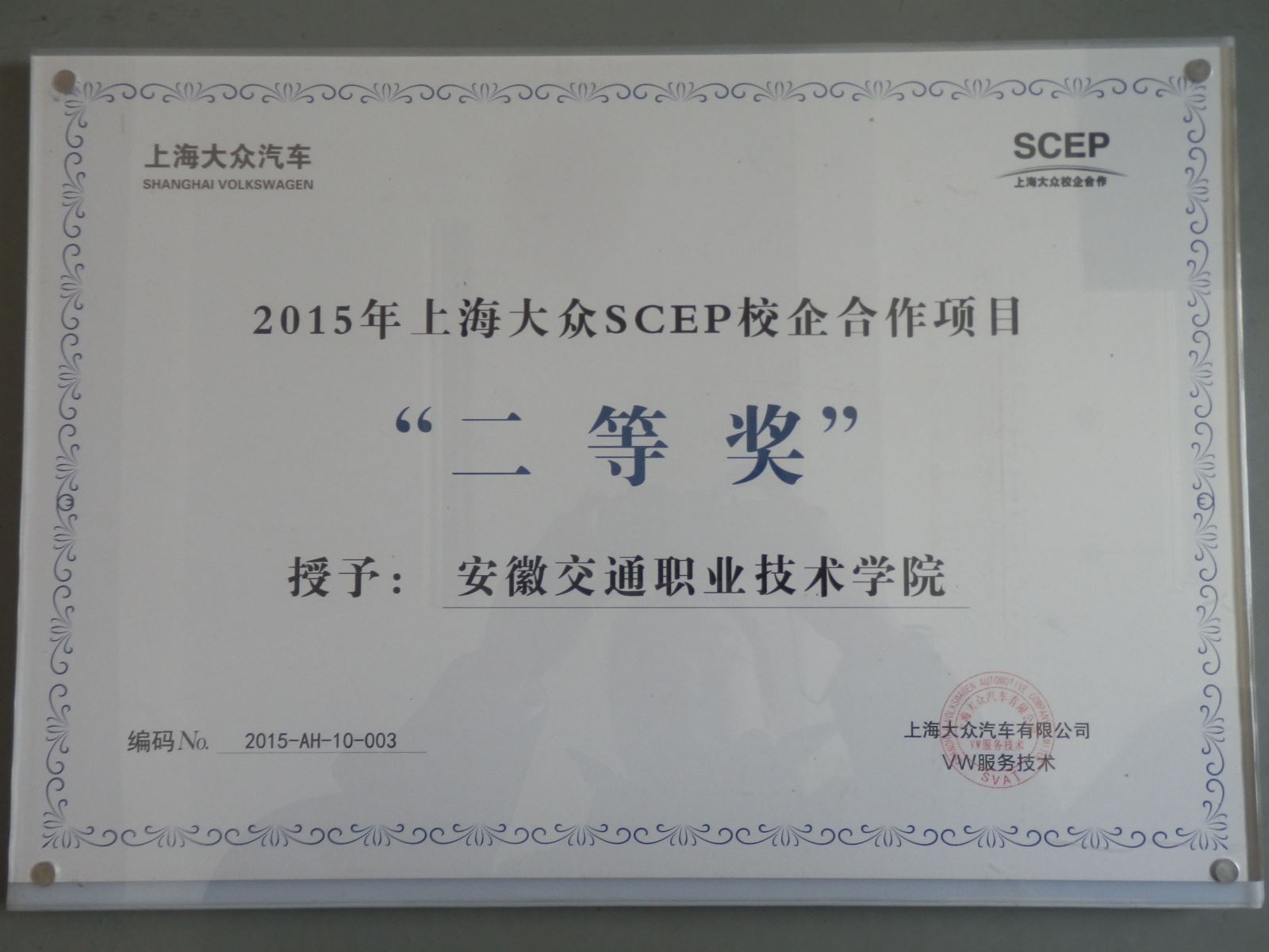 我院上海大眾SCEP校企合作項目獲2015年度上海大眾二等獎(總分排名全國第3名),SCEP項目教師團隊榮獲2015年度SCEP優秀師資團隊三等獎,劉耀邦老師榮獲項目新秀師資二等獎,在第二屆上海大眾SCEP校企合作項目技能大賽中,我院代表隊獲團體三等獎,同時大眾班學生畢景松同學獲大賽三等獎,何勇彪同學獲大賽優秀獎。