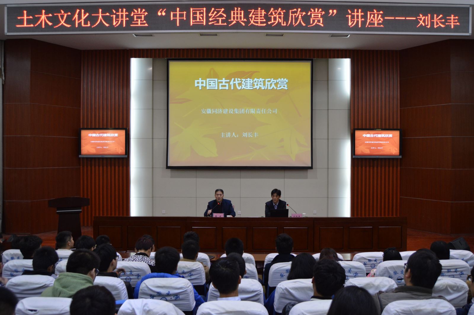 11月19日晚7點,同濟建設集團黨委委員、工會主席、安徽省開明畫院理事、省建筑業(yè)協(xié)會企業(yè)文化專業(yè)委員劉長豐應邀來院為我院學生作 “中國經(jīng)典建筑欣賞”的講座。