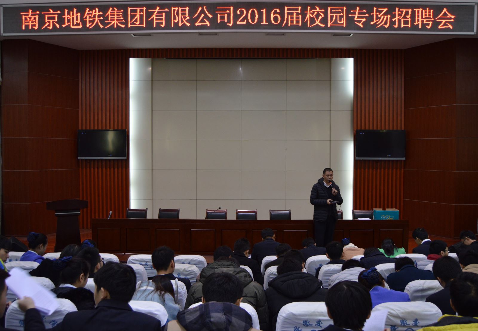 11月24日上午,南京地鐵集團(tuán)有限公司在北區(qū)多功能報(bào)告廳舉辦2016屆校園專場(chǎng)招聘會(huì), 約240名2016年畢業(yè)生參加招聘會(huì)。
