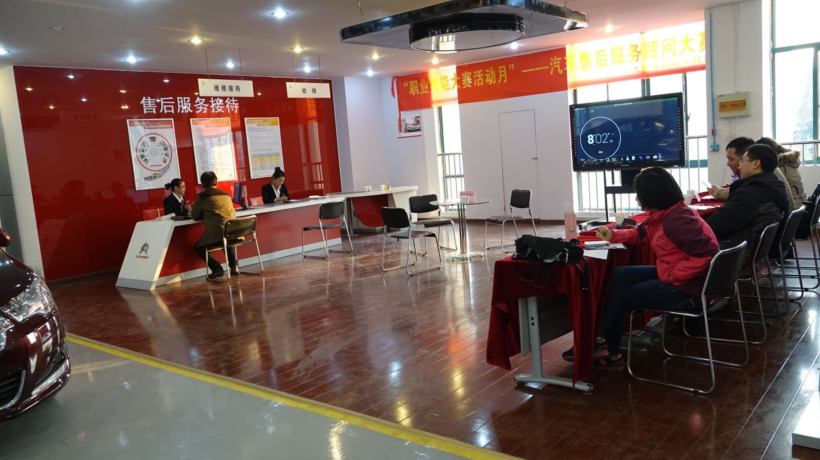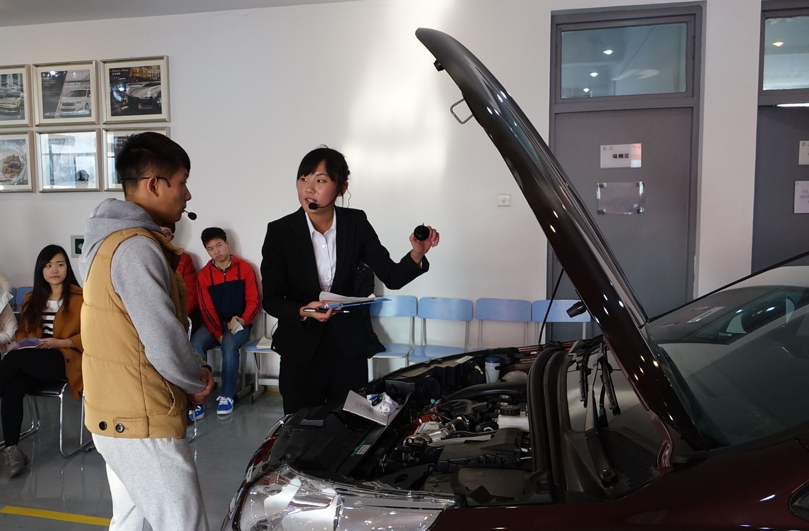 經過激烈的角逐共有10名選手進入決賽。參賽選手按照要求注意自己的儀容儀表和禮儀規范,樹立良好的形象。在模擬接待客戶過程中,13211班盧萬銀同學采取主動出擊方式,邊熱情地為客戶開車門,邊作自我介紹,并有禮貌地詢問客戶,通過一些賦有專業技巧的提問引導客戶詳細描述故障現象和維修需求并在預檢單上做好記錄。13251班徐文婷同學則從車輛維護期限方面獲取客戶及車輛信息,并對入場的客戶車輛進行環車檢查,就車輛外觀、隨車工具及發動機機艙等方面進行講解,并對檢查情況進行記錄,雙方簽字確認。隨后的參賽選手也對客戶耐心解釋、詳細說明了維修保養內容和費用等情況。在向客戶交付車輛過程中,參賽選手為車輛拆除防護措施,并向客戶詳細說明下次保養的時間及車輛保養的注意事項,向客戶征詢對此次服務的滿意度,并與客戶禮貌告別。