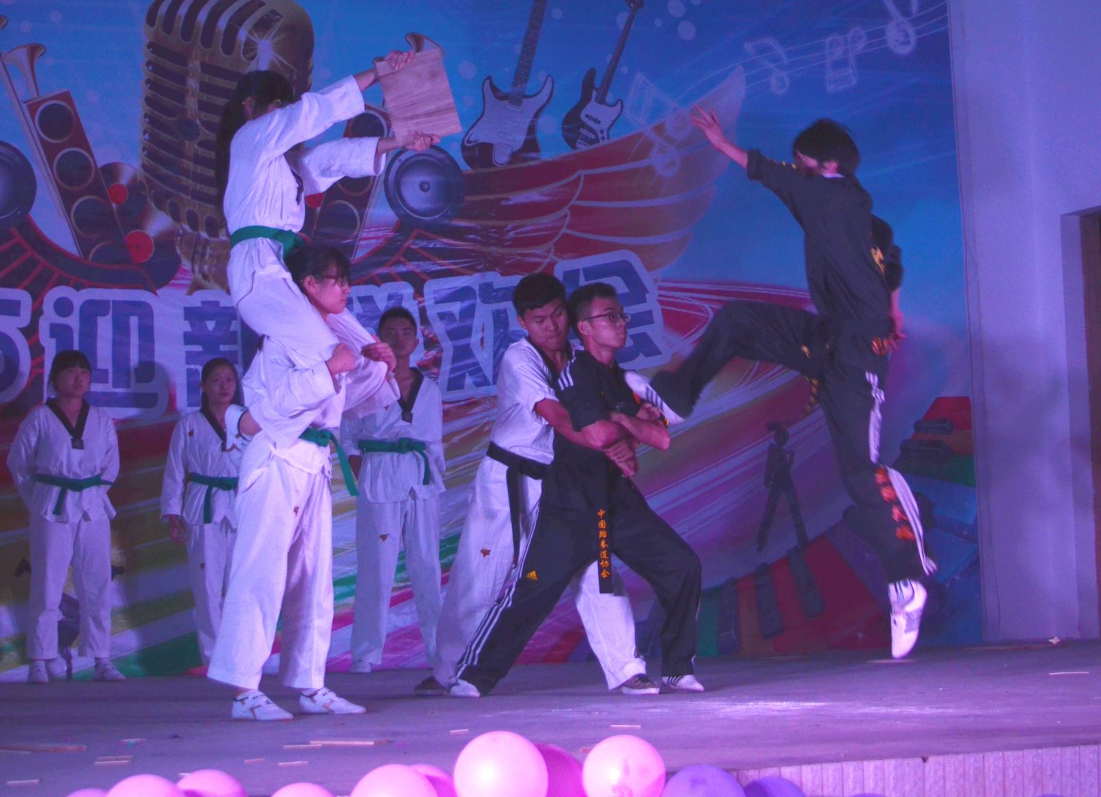 一開場迎新視頻生動展現了新生報到的場面。隨后,卓越吉他社的精彩吉他表演正式拉開了晚會帷幕。歌舞、相聲、小品、街舞、跆拳道、雙截棍等精彩的節目表達了學院對新同學的熱烈歡迎。舞蹈《Happy Young》動作優美,引人入勝;大一新同學屈文杰表演的獨舞帶來了一波小小的熱潮,動感的音樂,性感的舞姿,引得臺下的同學叫好連連;笑語堂自編、自導、自演的小品《團結的故事》,生動的展現了我院學子的幽默與可愛。詼諧的語言,滑稽的表演,令人不禁捧腹大笑。