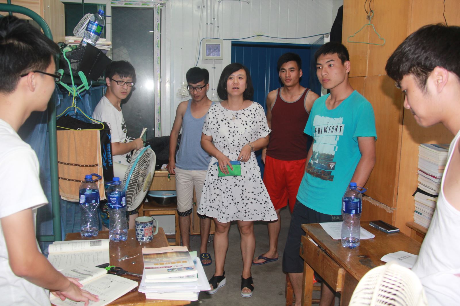 7月12日下午,水運工程系黨支部書記、副主任朱蓉在學(xué)管朱宸老師的陪同下,前往模擬船實訓(xùn)中心和學(xué)生宿舍看望慰問2014級暑期參加四小證培訓(xùn)考試的老師和同學(xué)們。